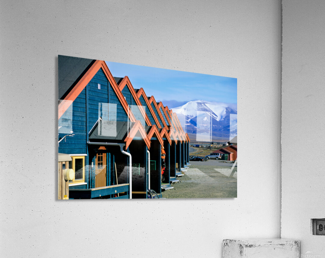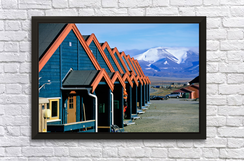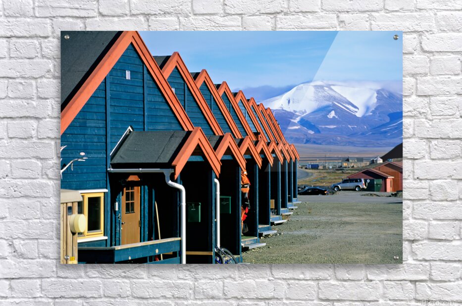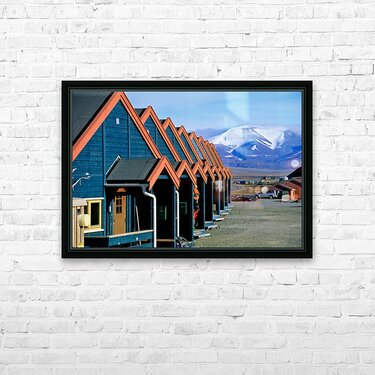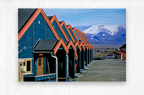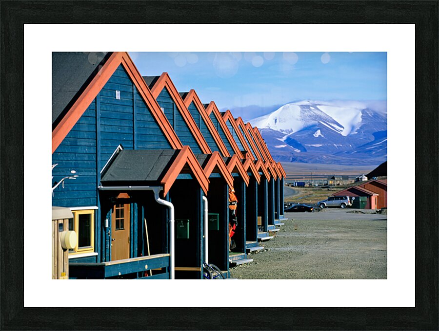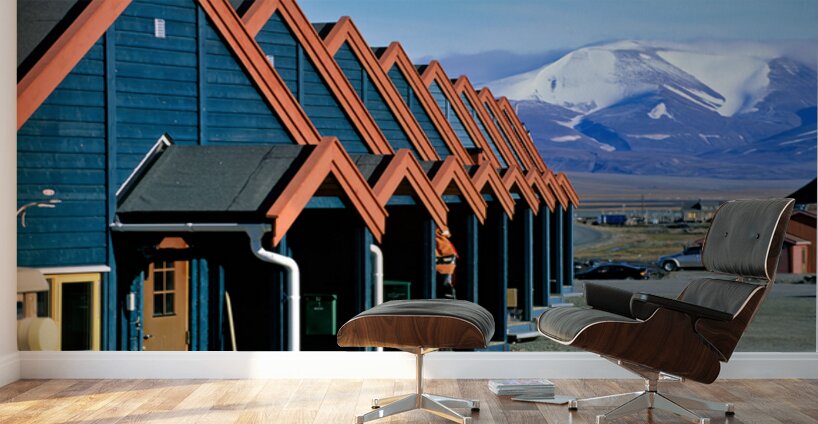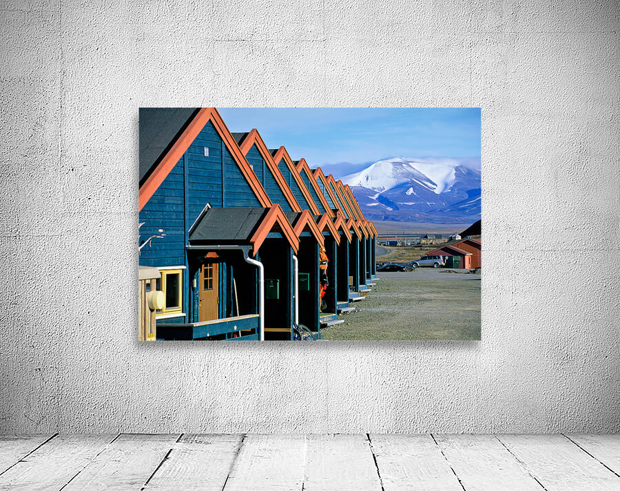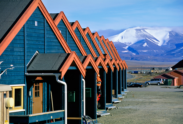 Cabins stand closely together in Longyearbyen a remote location in Svalbard. Mountains and snow are visible in the background on a clear day.