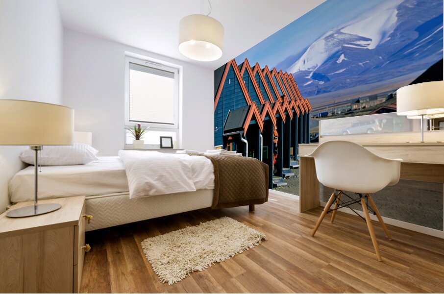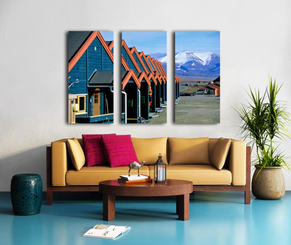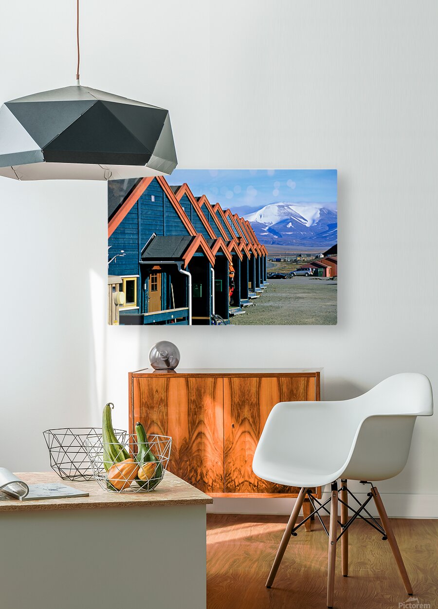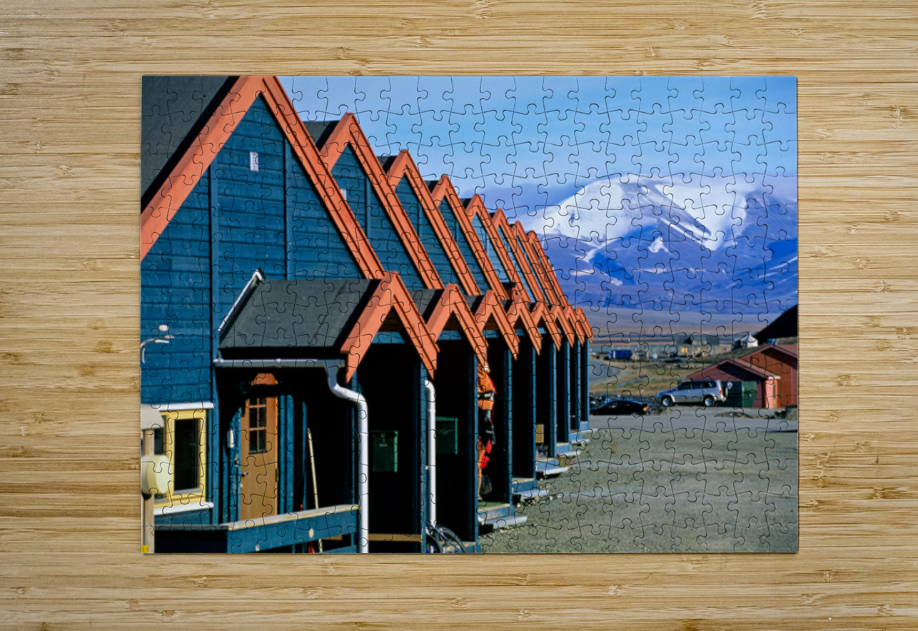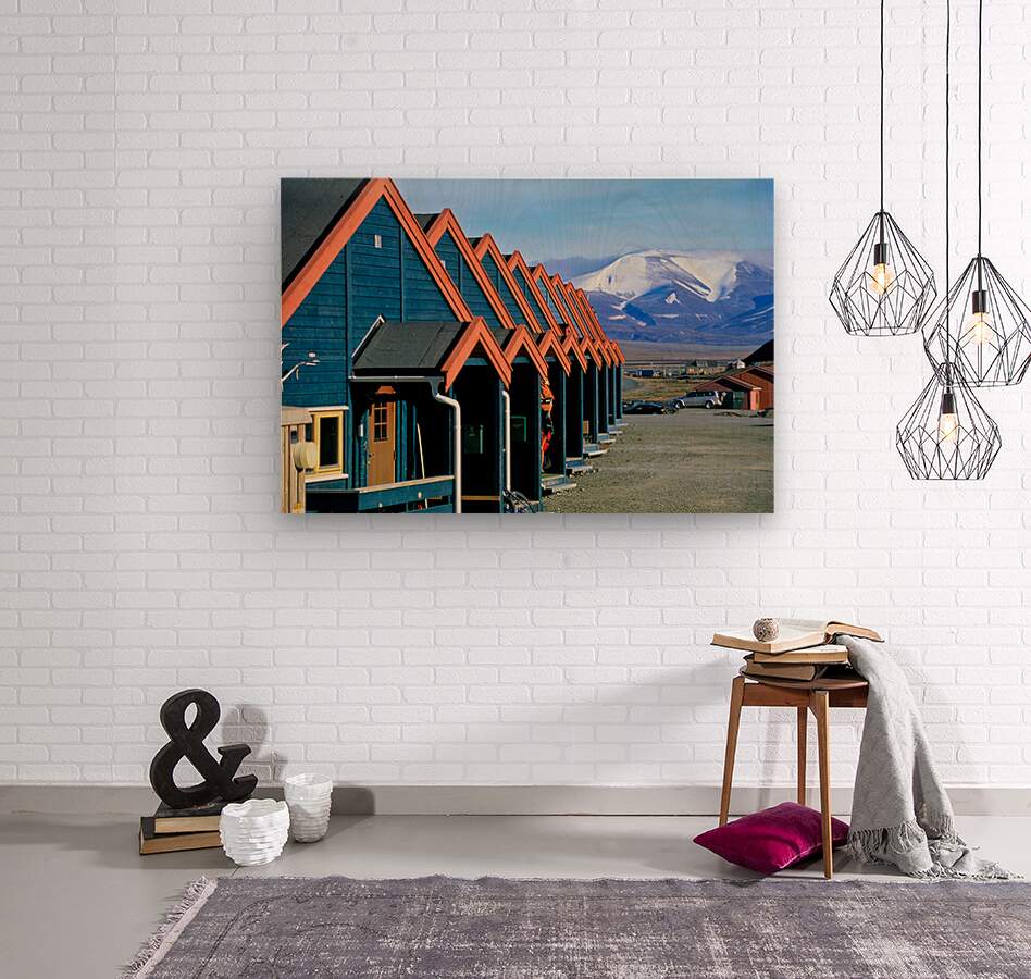 Cabins stand closely together in Longyearbyen a remote location in Svalbard. Mountains and snow are visible in the background on a clear day.