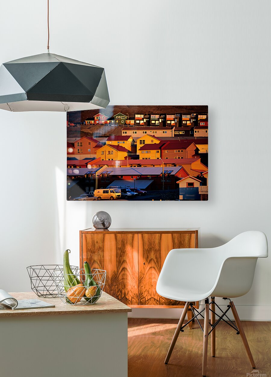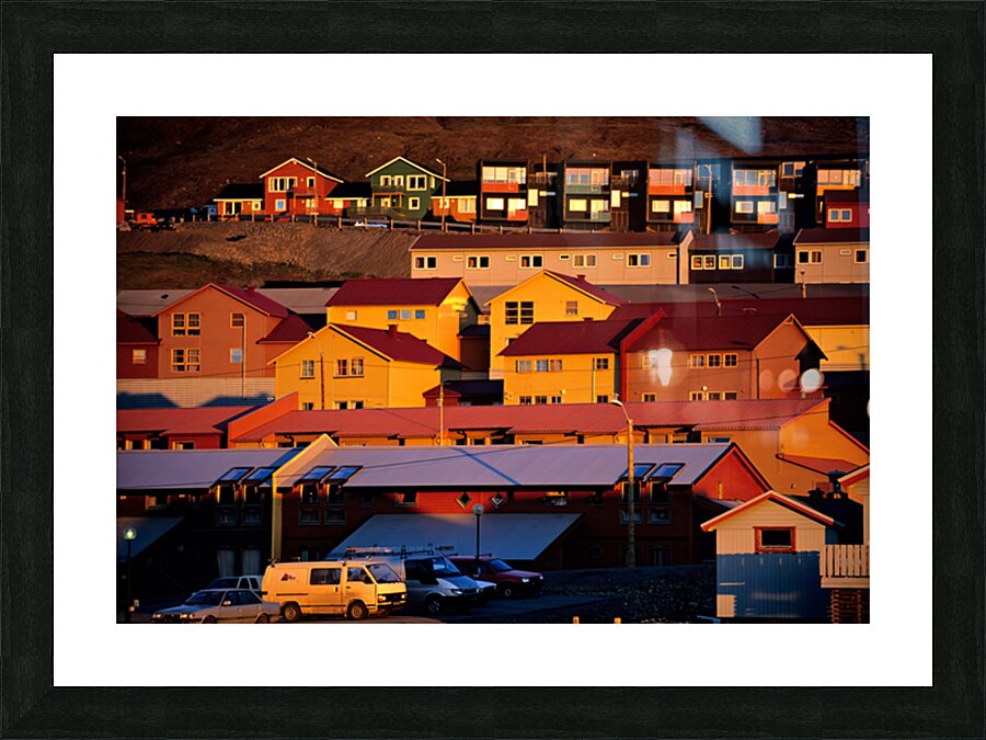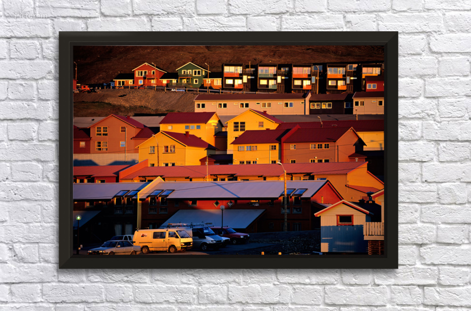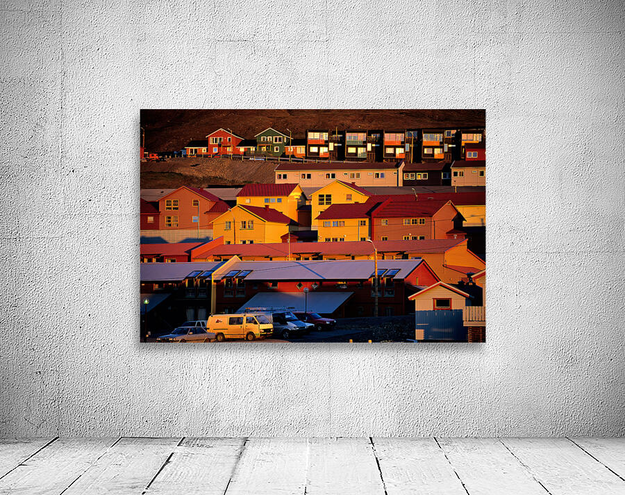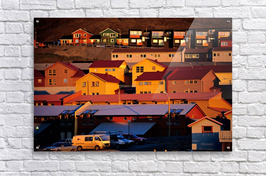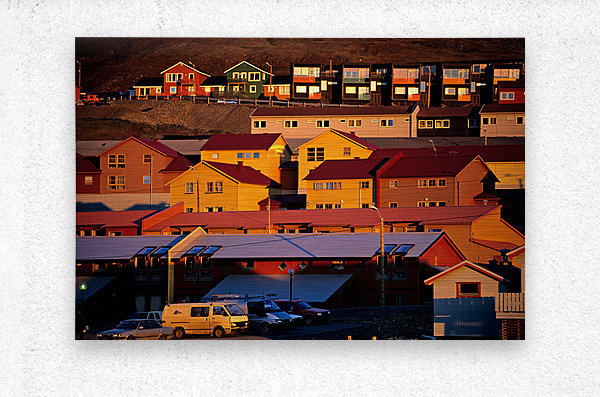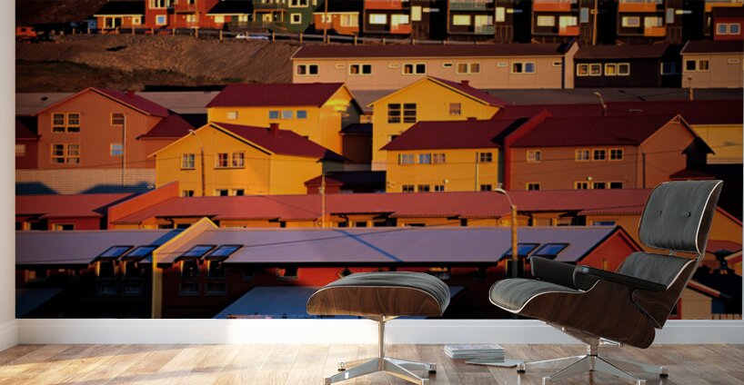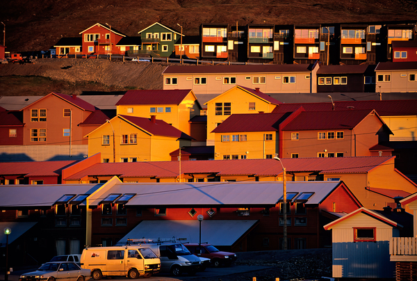 Buildings stand on a hillside in Longyearbyen under warm light. The red and yellow houses show the unique architecture of the Arctic region.