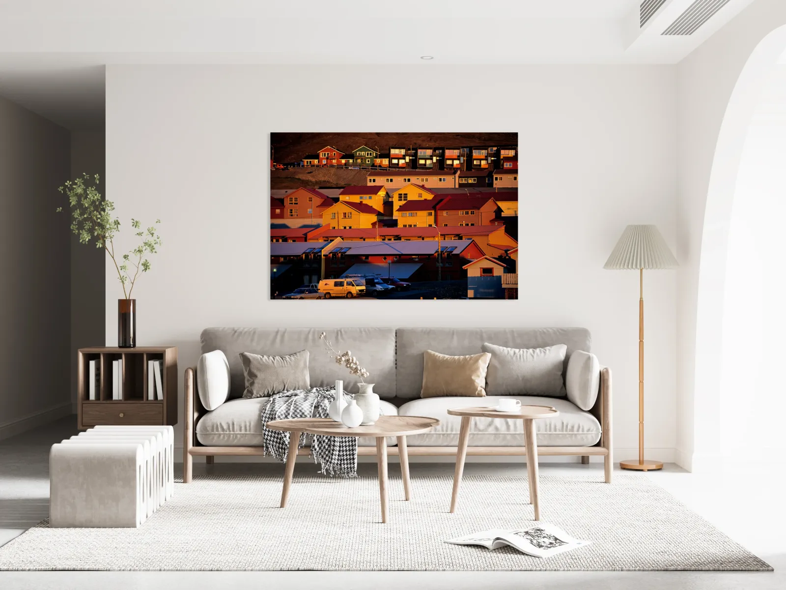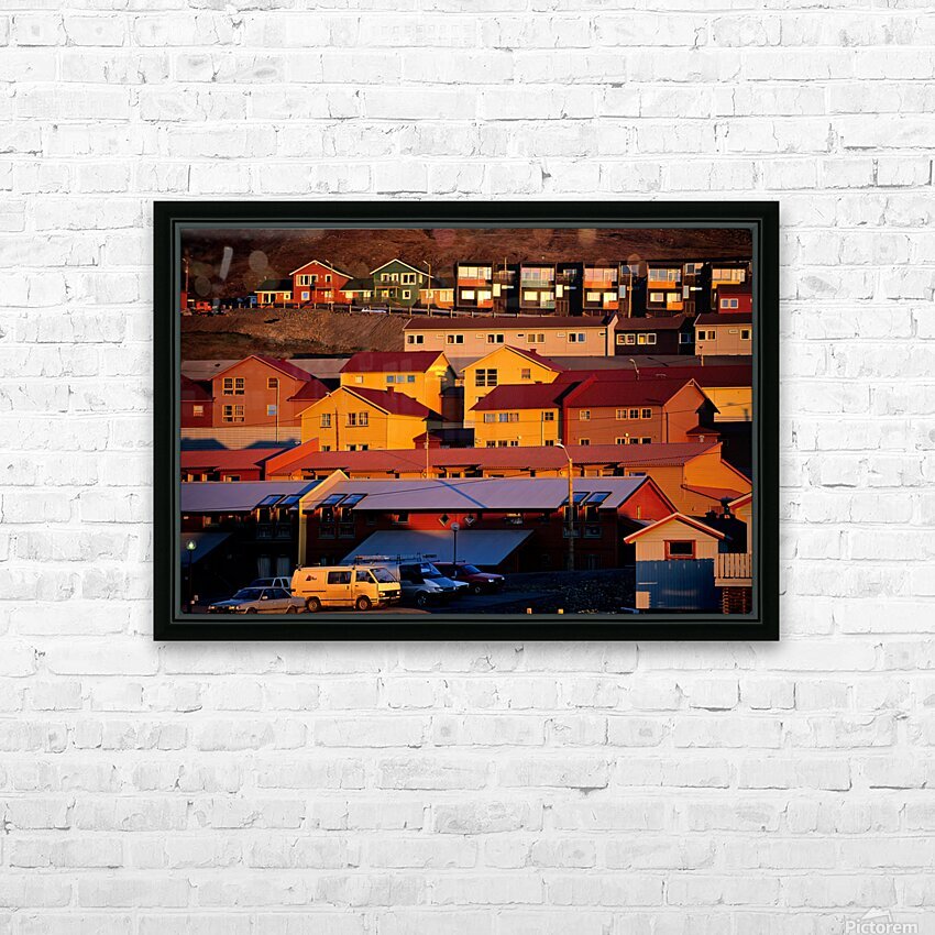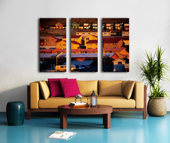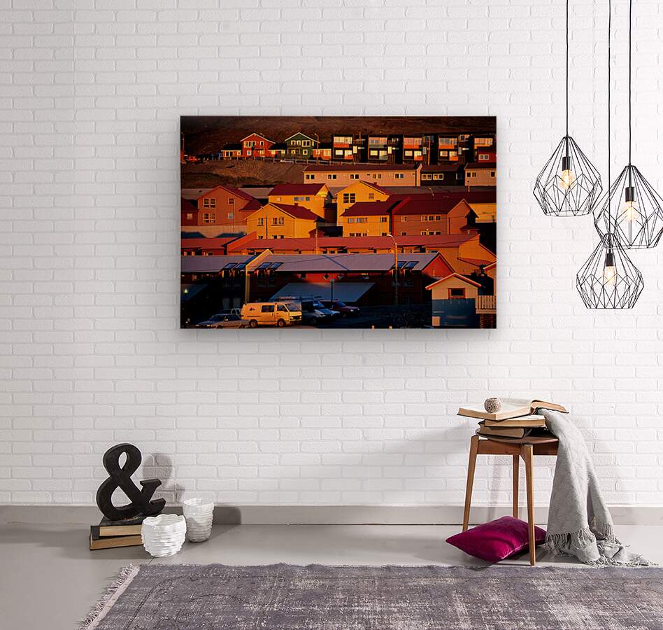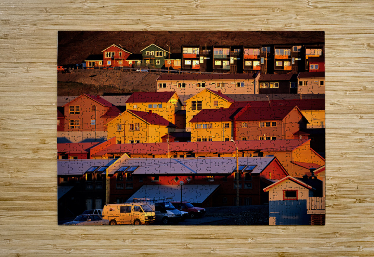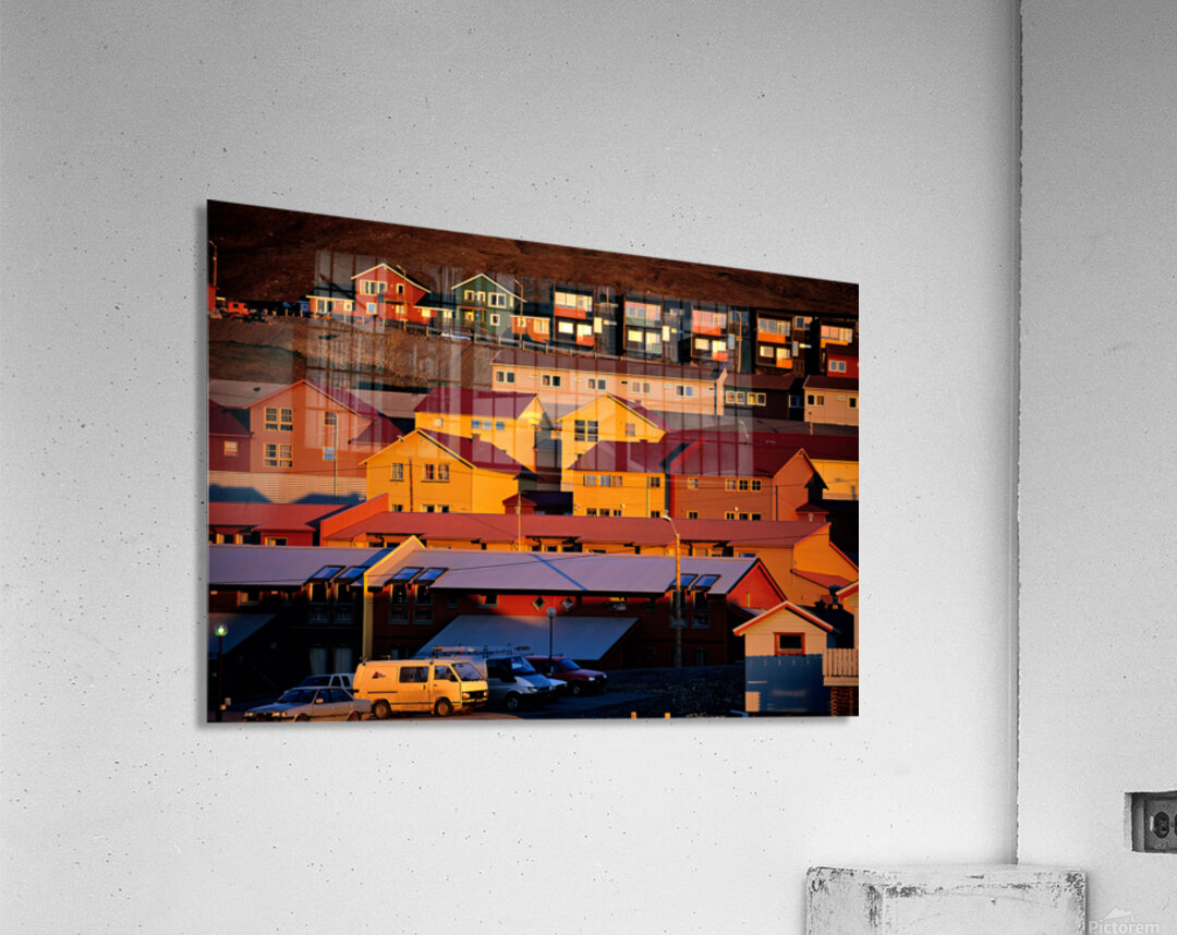 Buildings stand on a hillside in Longyearbyen under warm light. The red and yellow houses show the unique architecture of the Arctic region.