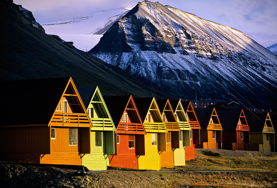 Cabins with bright colors sit at the foot of mountains in Longyearbyen Svalbard. Snow covers the peaks while sunlight touches the cabins.