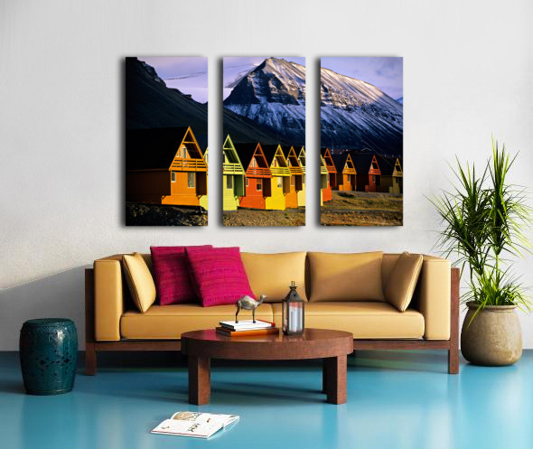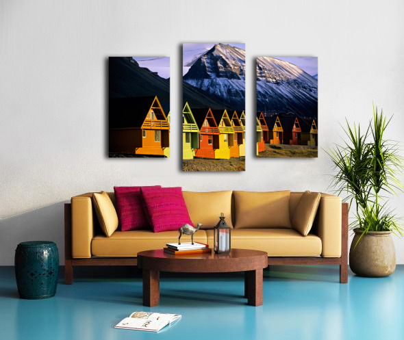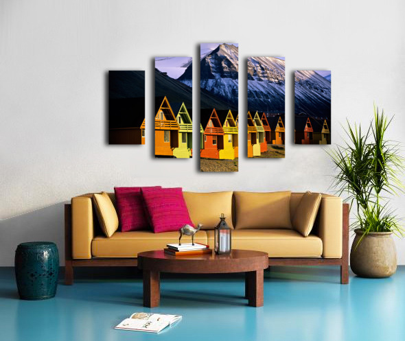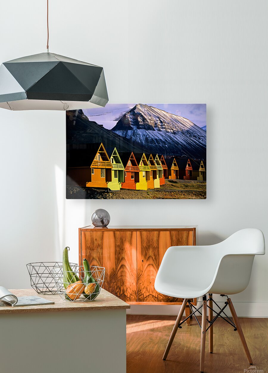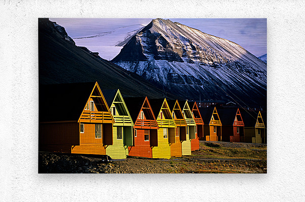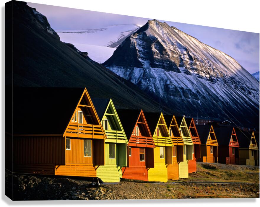 ABOUT THIS ARTWORK: COLORFUL CABINS IN LONGYEARBYEN SVALBARD NEAR SNOWY MOUNTAINS