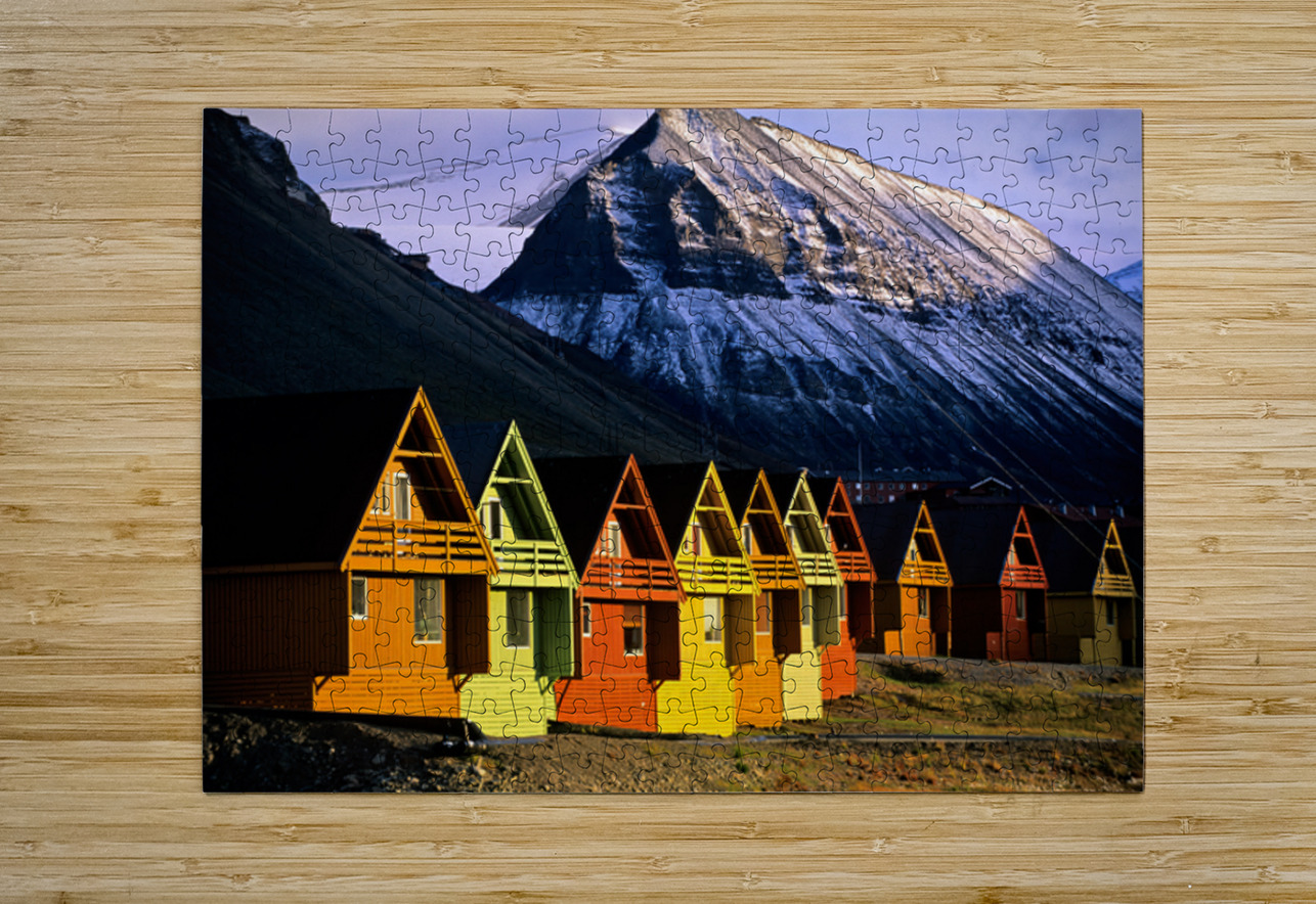 Colorful cabins in Longyearbyen Svalbard near snowy mountains Marco Brivio Puzzle printing