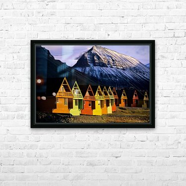 Get this artwork "Colorful cabins in Longyearbyen Svalbard near snowy mountains" in a framed print.