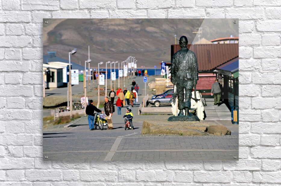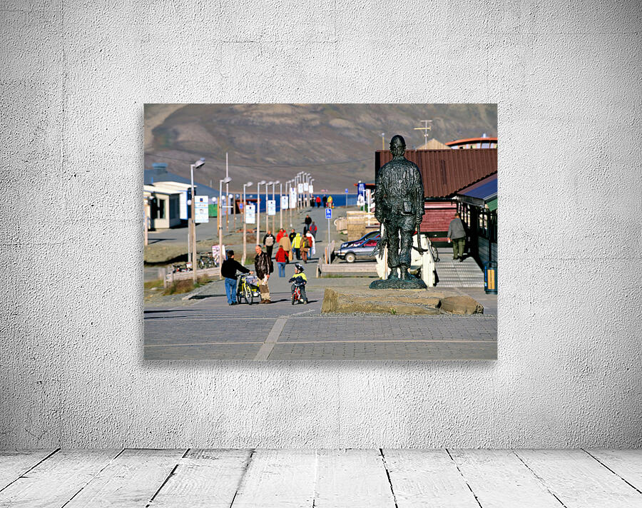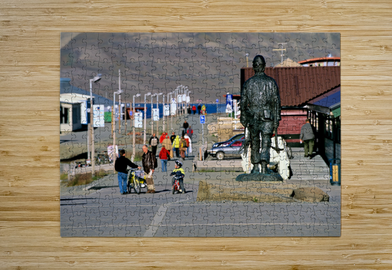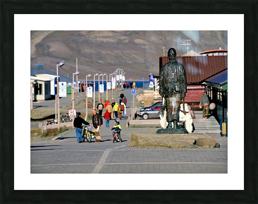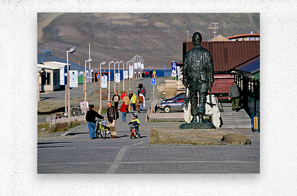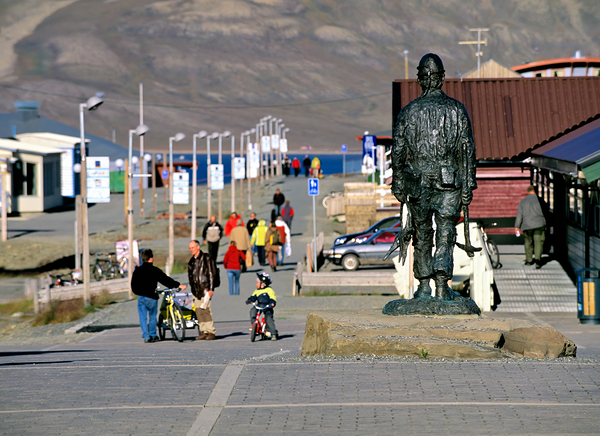 People walk along the streets of Longyearbyen with a statue in the foreground. Children ride bikes while others explore the area.