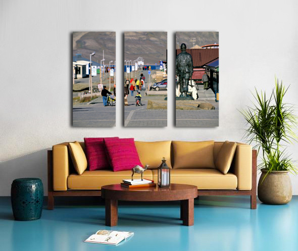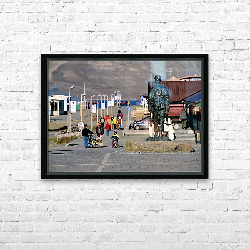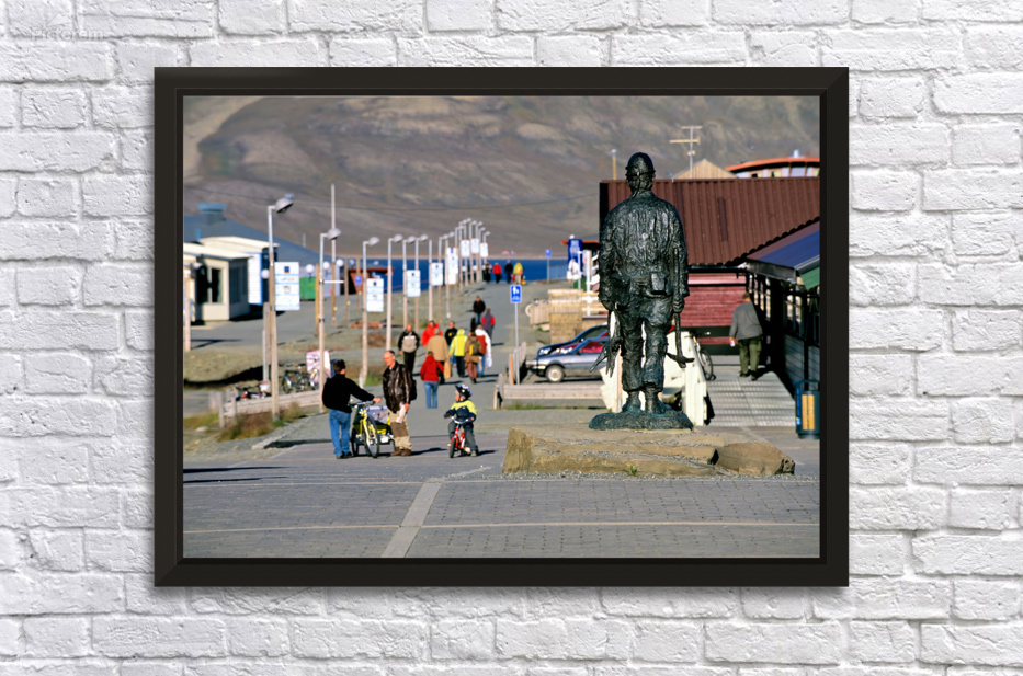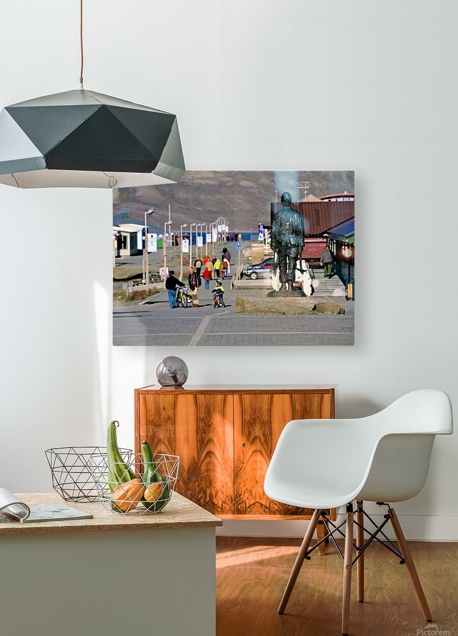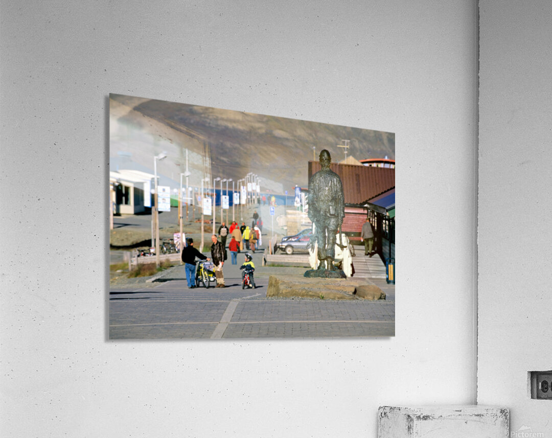 People walk along the streets of Longyearbyen with a statue in the foreground. Children ride bikes while others explore the area.