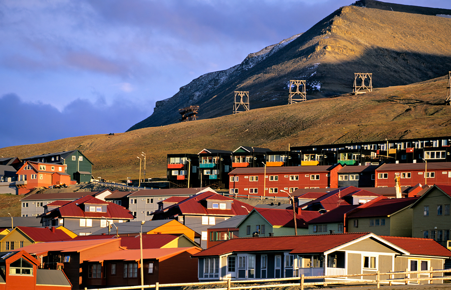 COLORFUL BUILDINGS IN LONGYEARBYEN SVALBARD AT SUNSET