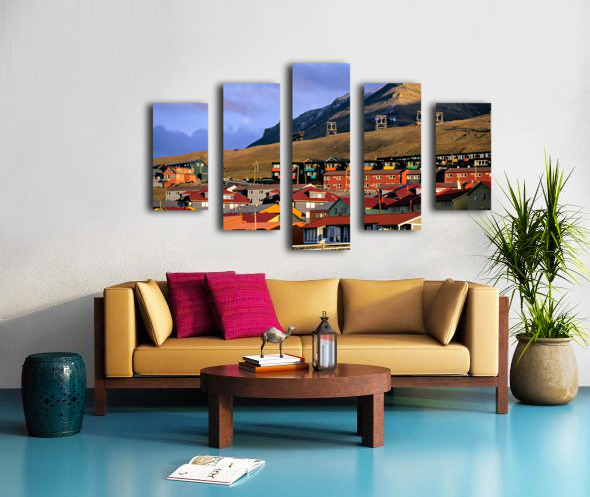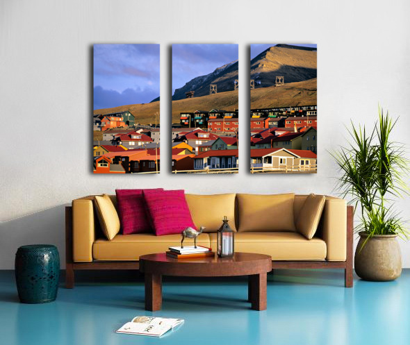 Colorful buildings in Longyearbyen Svalbard at sunset Frame print
