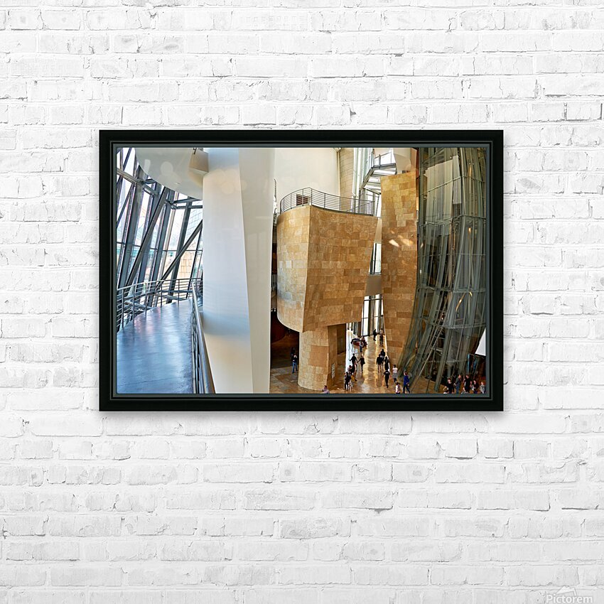 Get this artwork "Inside Guggenheim Museum in Bilbao Spain with visitors walking" in a framed print.