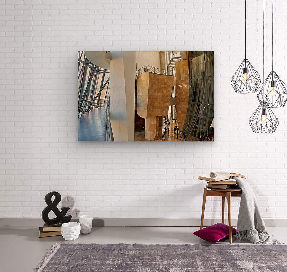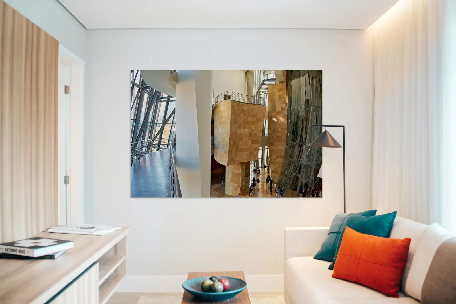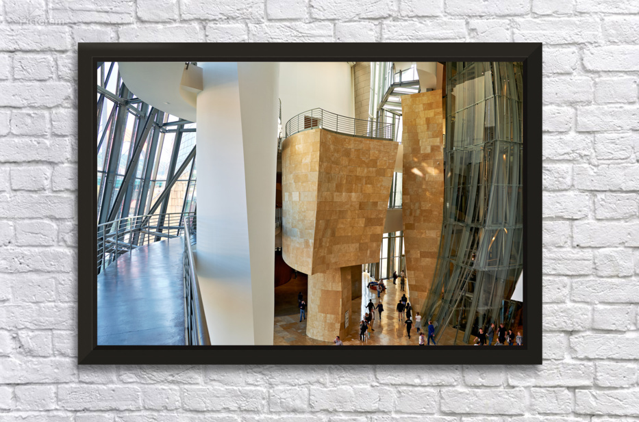 People walk inside the Guggenheim Museum in Bilbao Spain. The unique architecture creates interesting shapes and large open spaces.