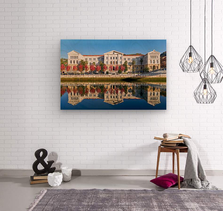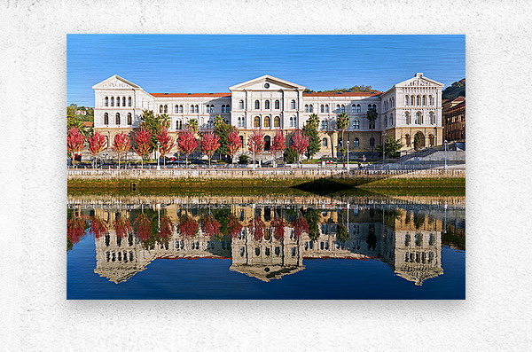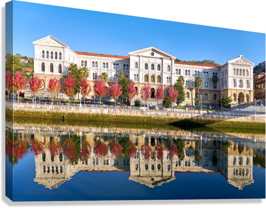 ABOUT THIS ARTWORK: UNIVERSITY BUILDING REFLECTS IN WATER IN BILBAO SPAIN