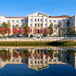 The university building sits along the river in Bilbao Spain. The trees with red leaves stand in front of the structure.