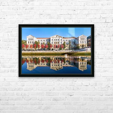 Get this artwork "University building reflects in water in Bilbao Spain" in a framed print.