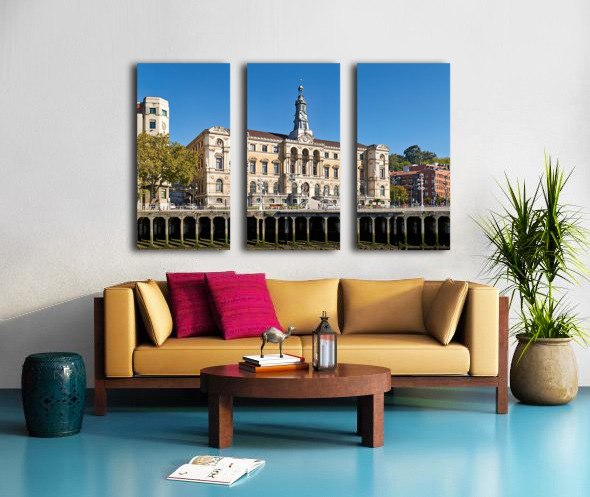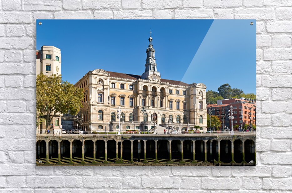Get this artwork "Building stands in Bilbao Spain next to water and trees" in a framed print.
