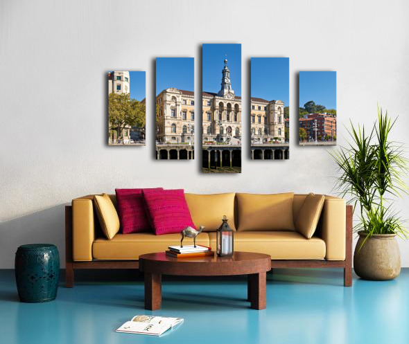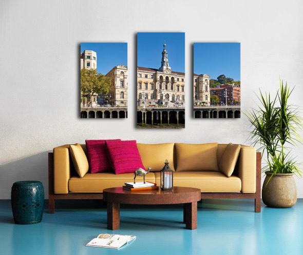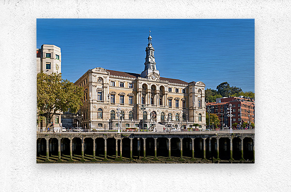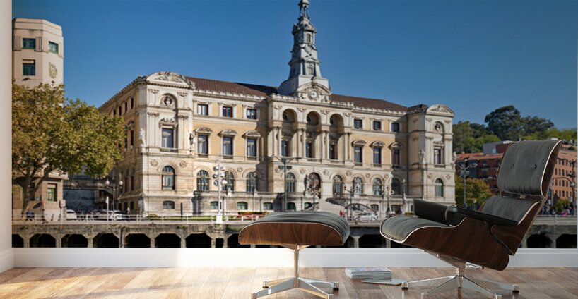 City Hall in Bilbao shows its historical architecture by the river with buildings and trees surrounding it under a clear blue sky.