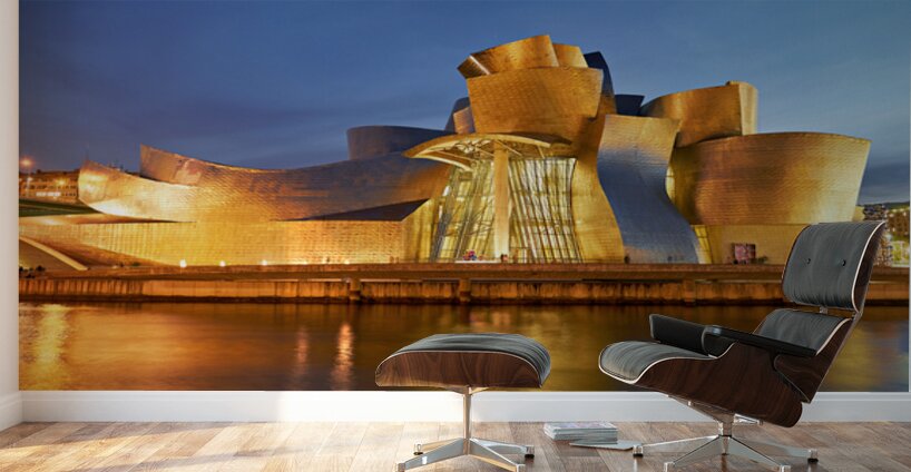 ABOUT THIS ARTWORK: GUGGENHEIM MUSEUM SHINES AT NIGHT IN BILBAO SPAIN
