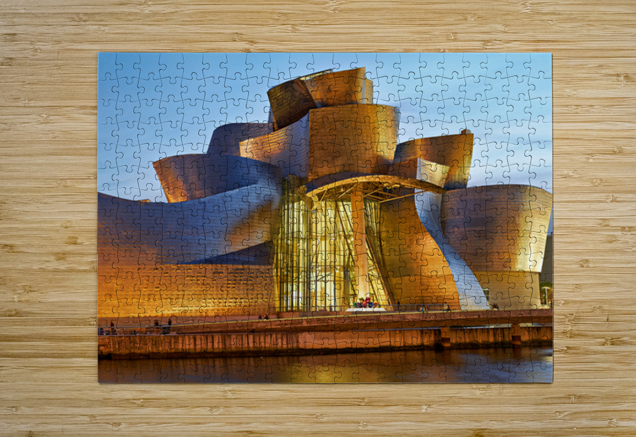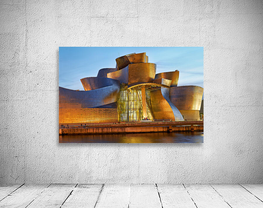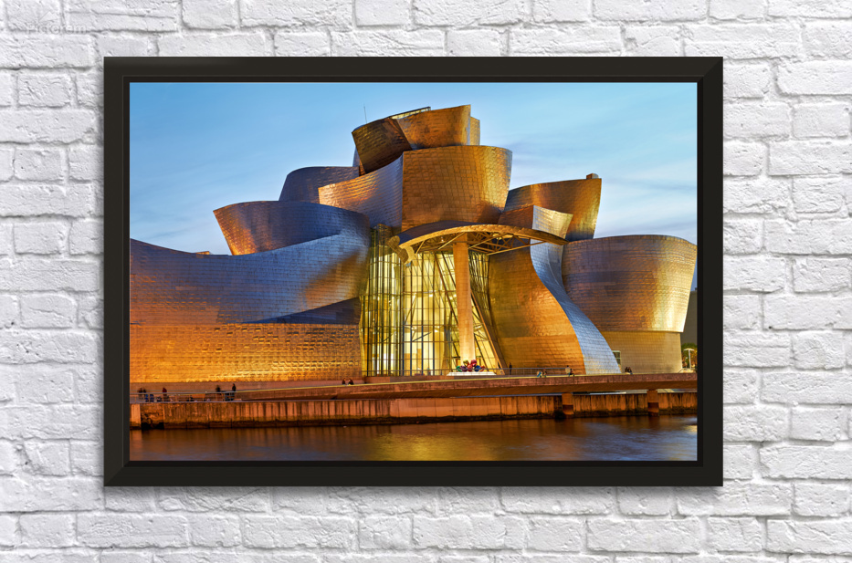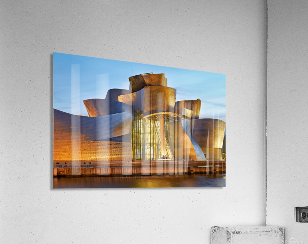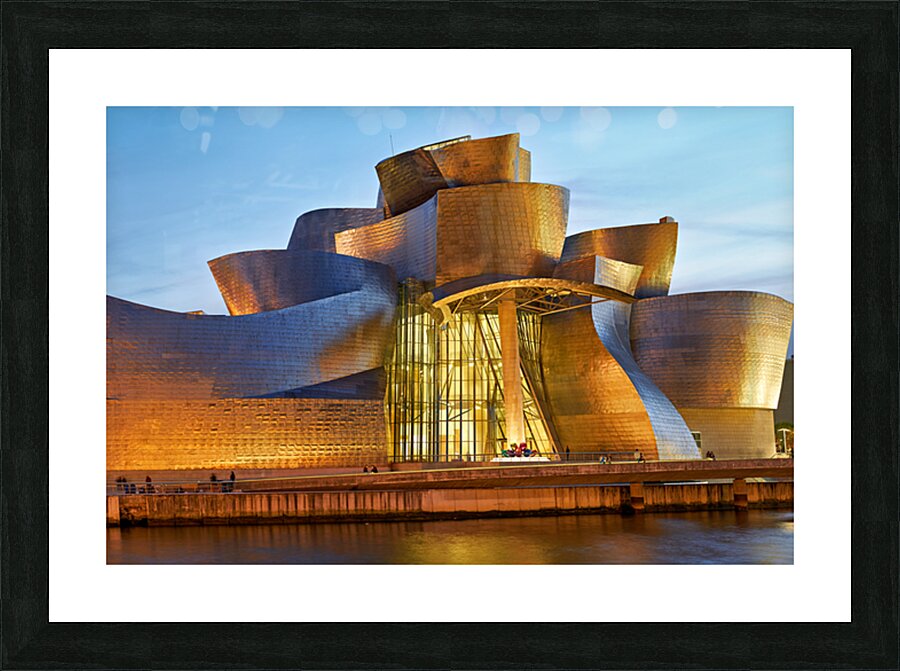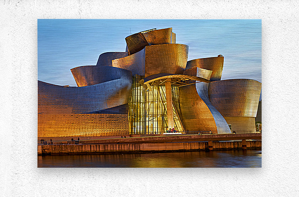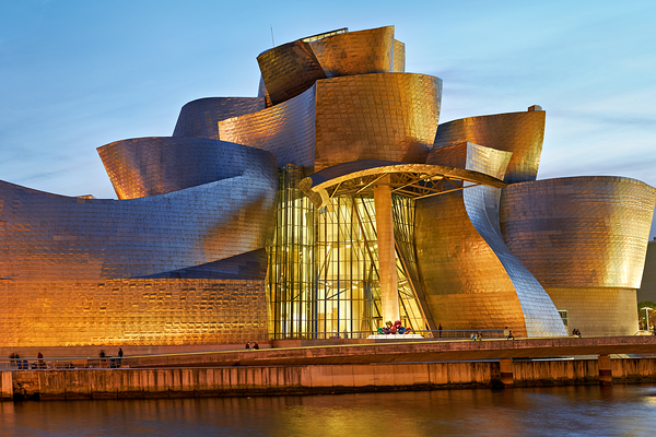 The Guggenheim Museum stands tall in Bilbao Spain illuminated as night falls and the river reflects its light.