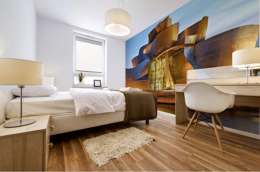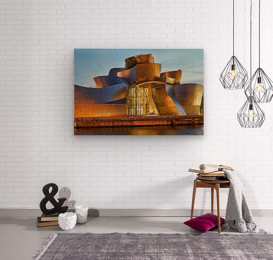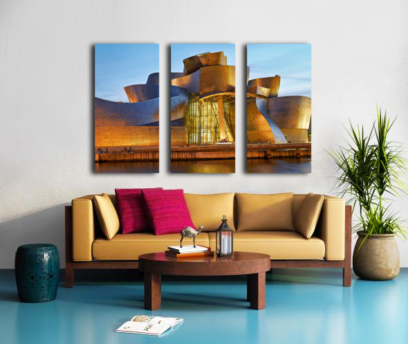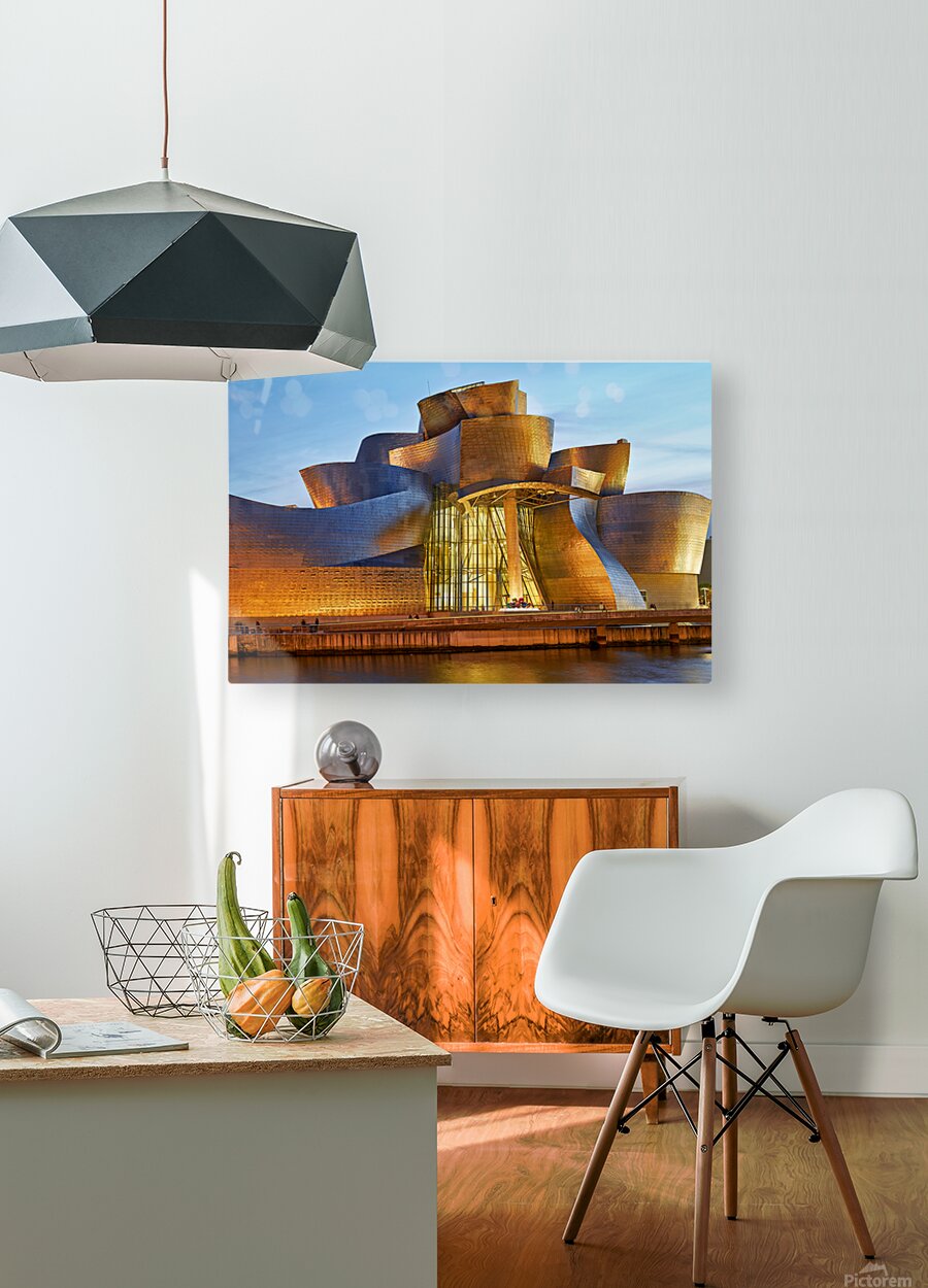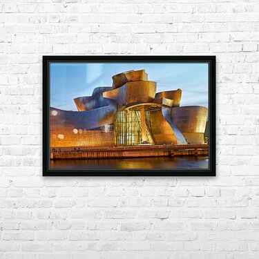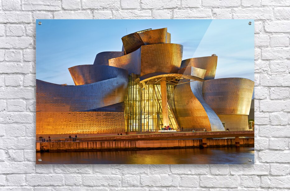 The Guggenheim Museum stands tall in Bilbao Spain illuminated as night falls and the river reflects its light.