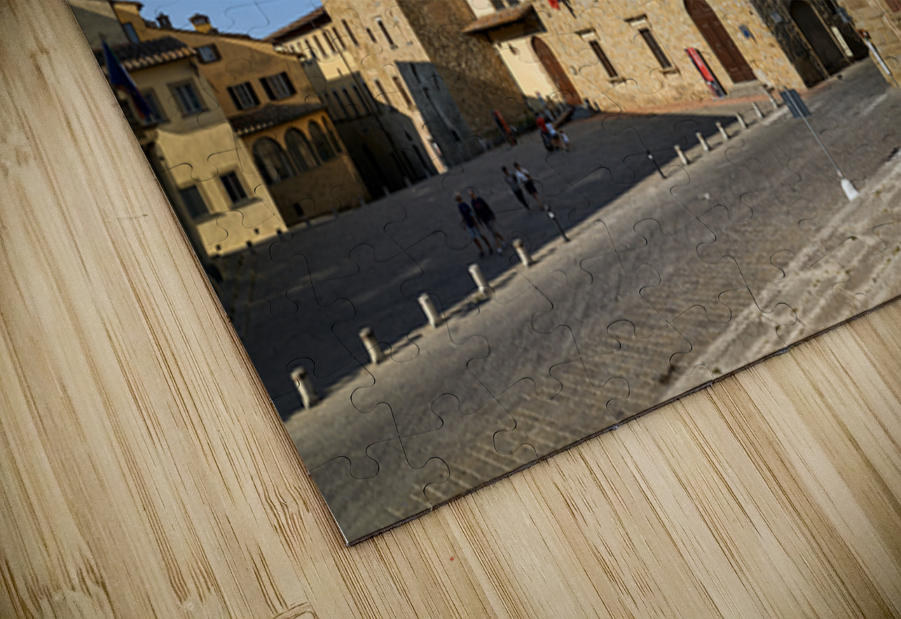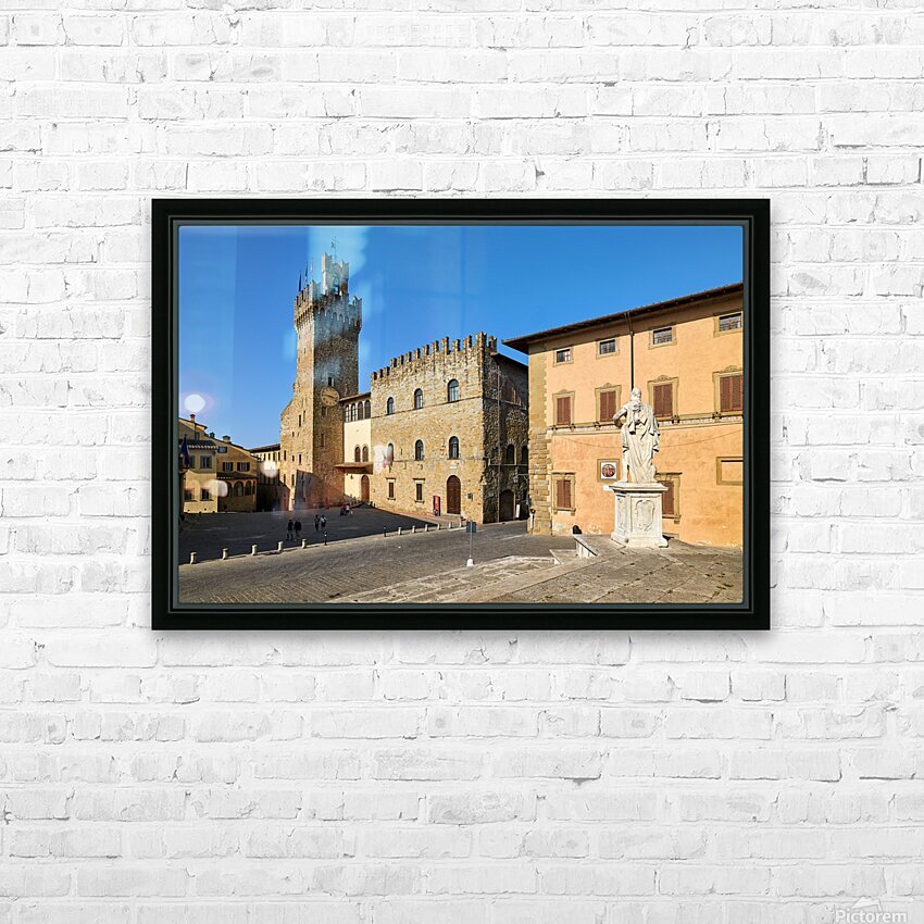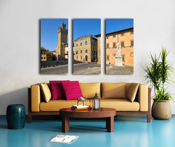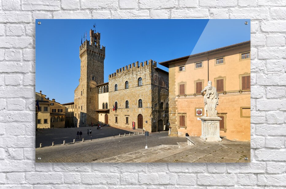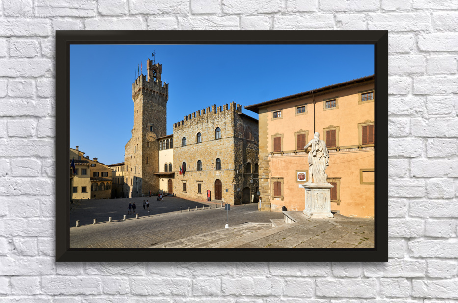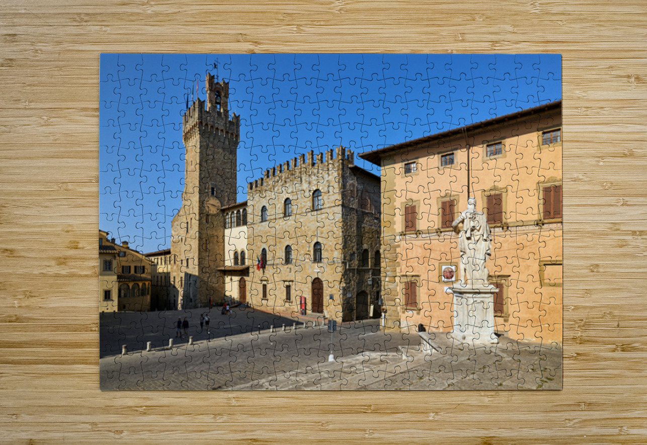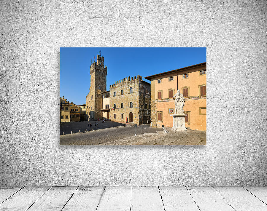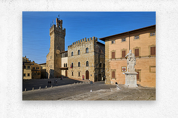 Arezzo shows the Palazzo dei Priori with its stone walls and clock. Visitors explore the square under clear blue skies.