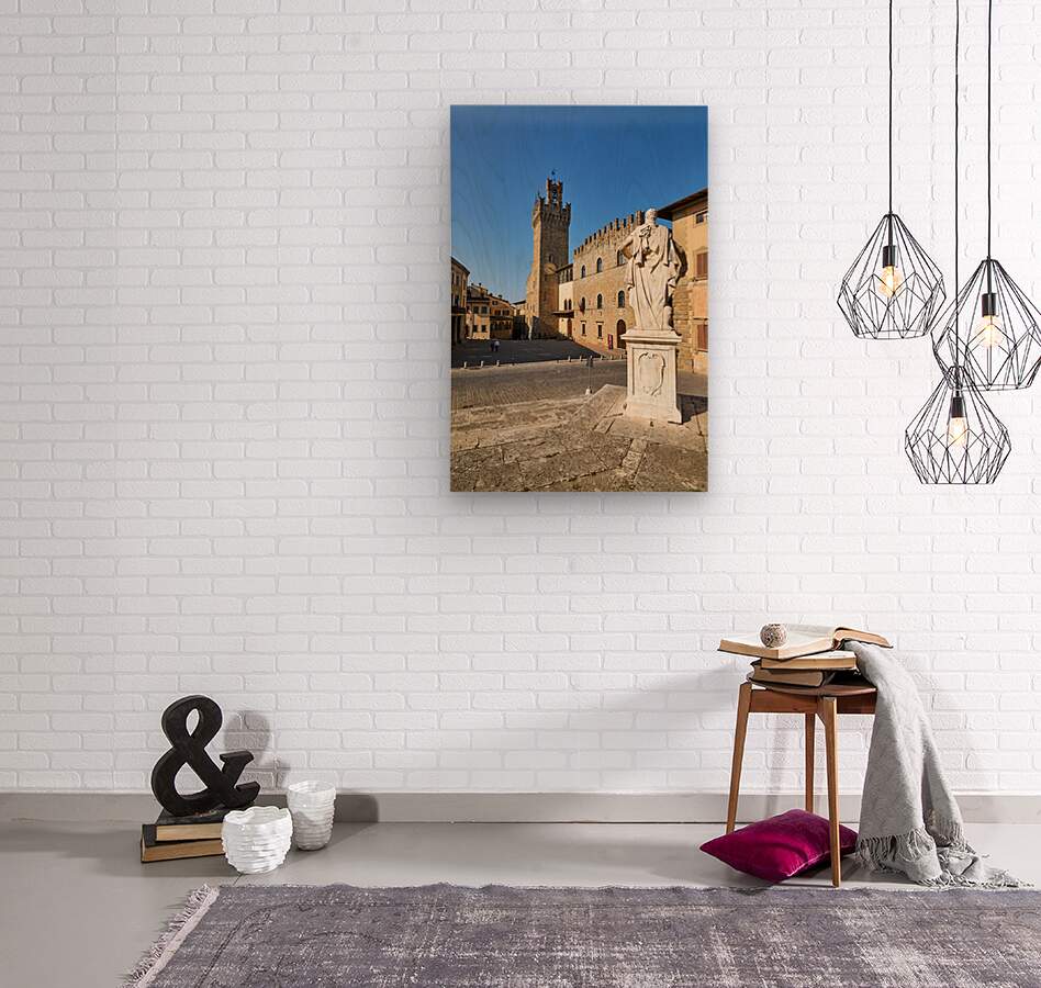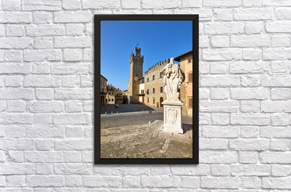 Visitors explore the historic Palazzo dei Priori in Arezzo. A statue stands in the square under bright blue skies.