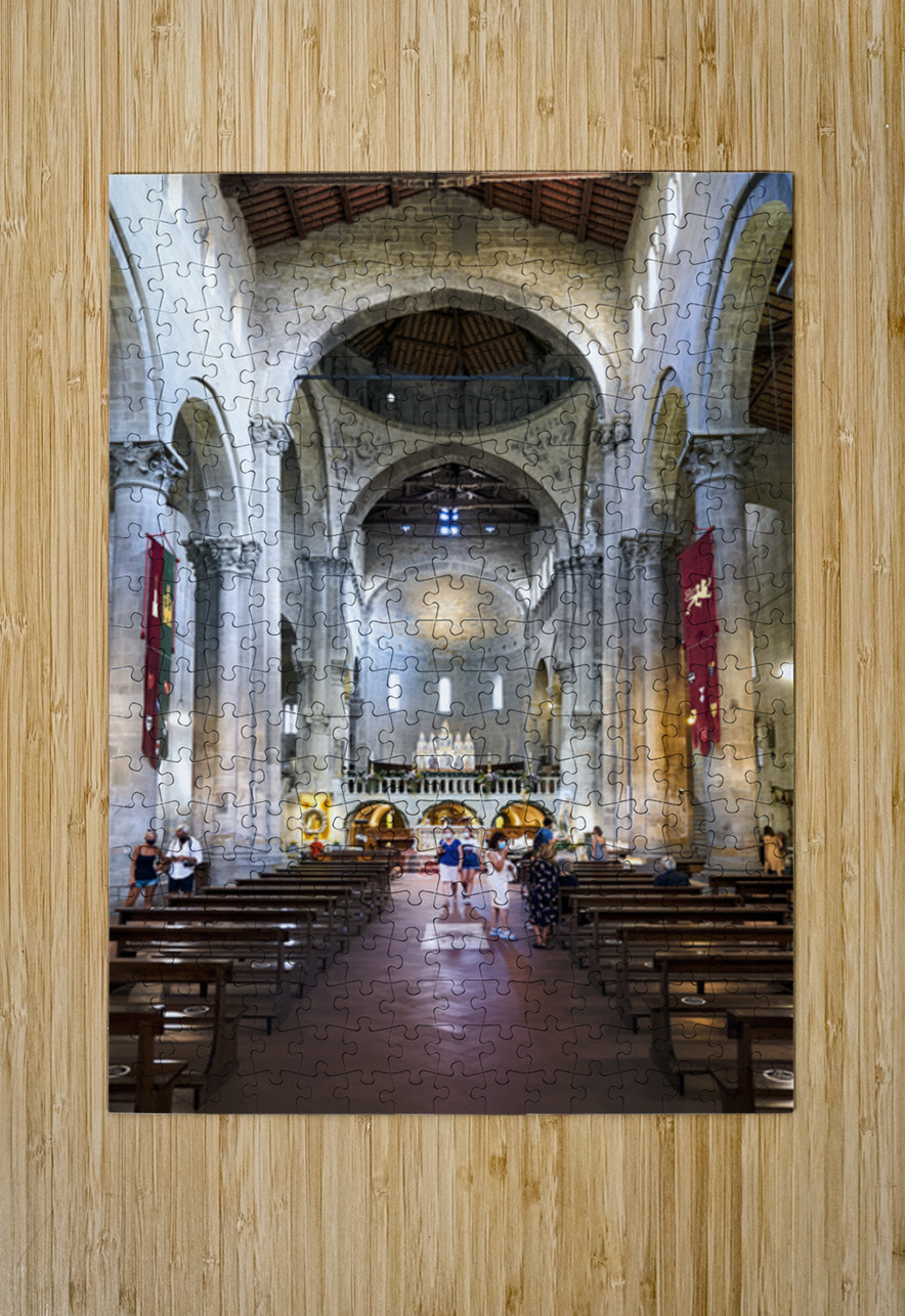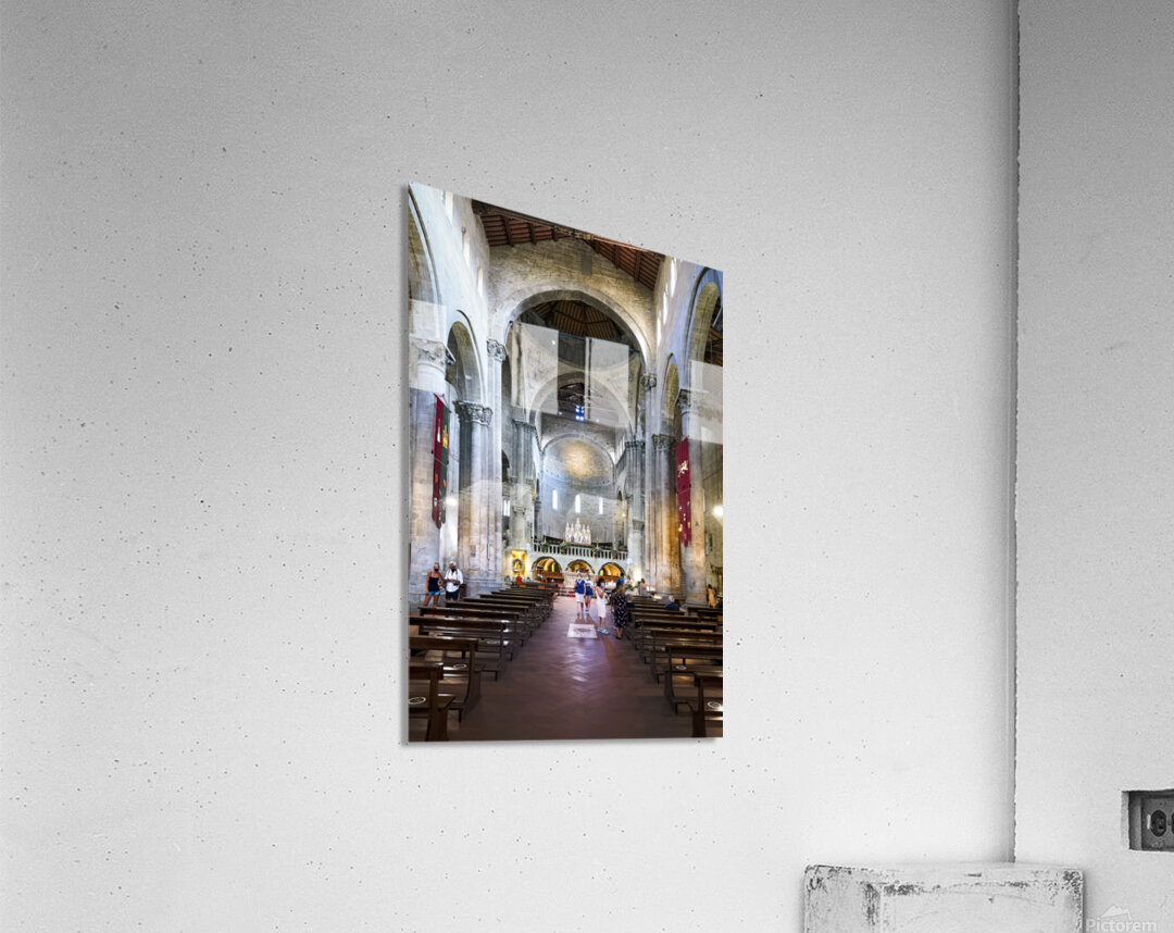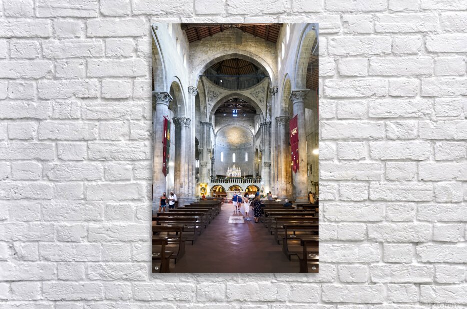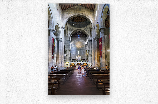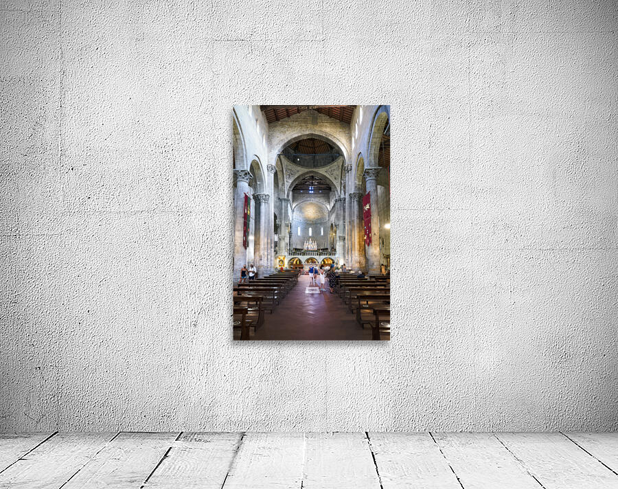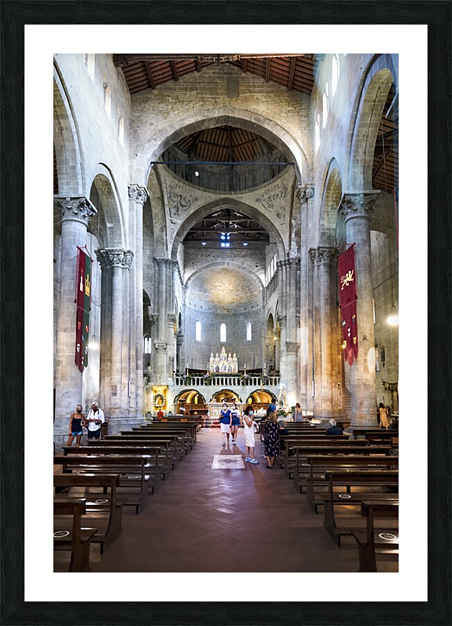 People walk through the interior of Santa Maria della Pieve in Arezzo. The church shows historical architecture and religious art.