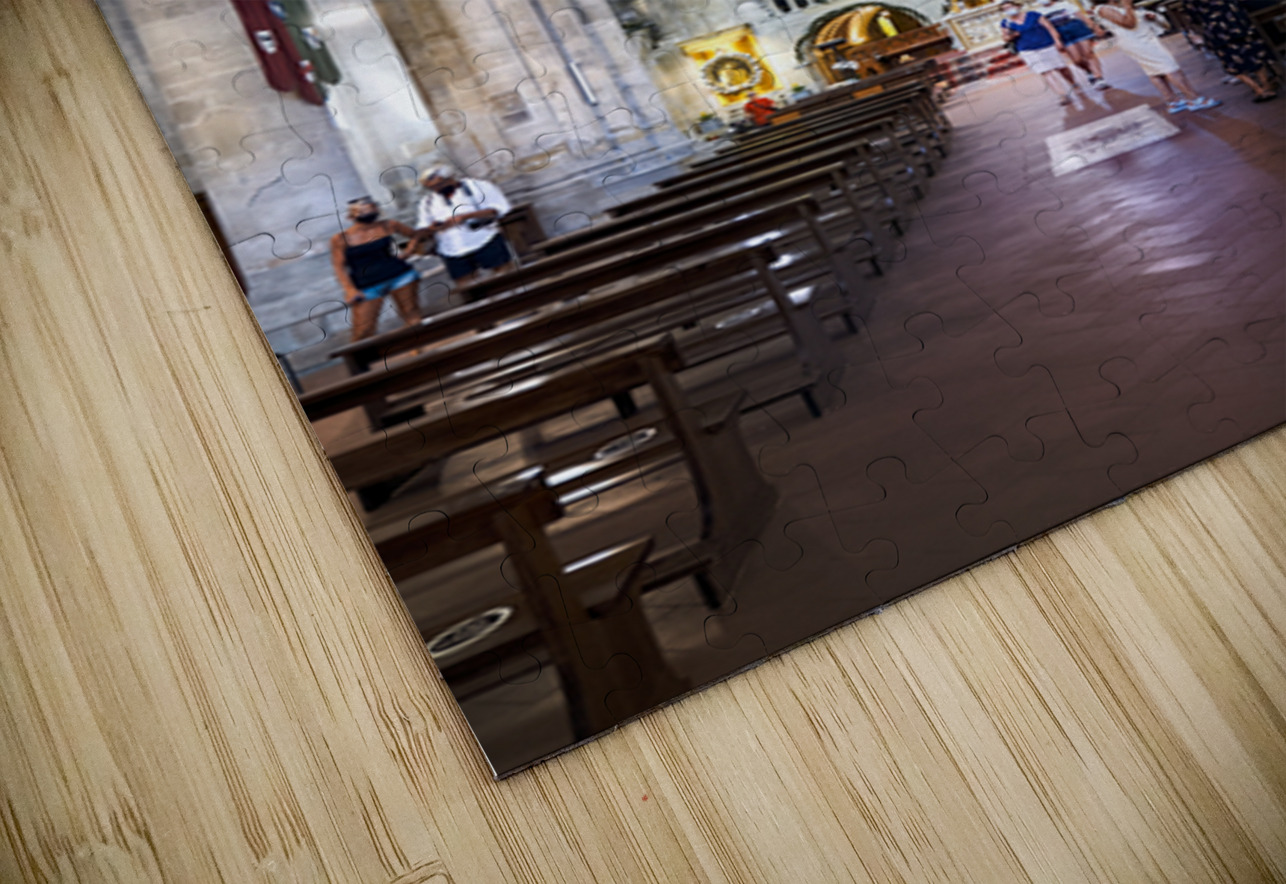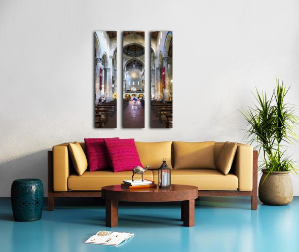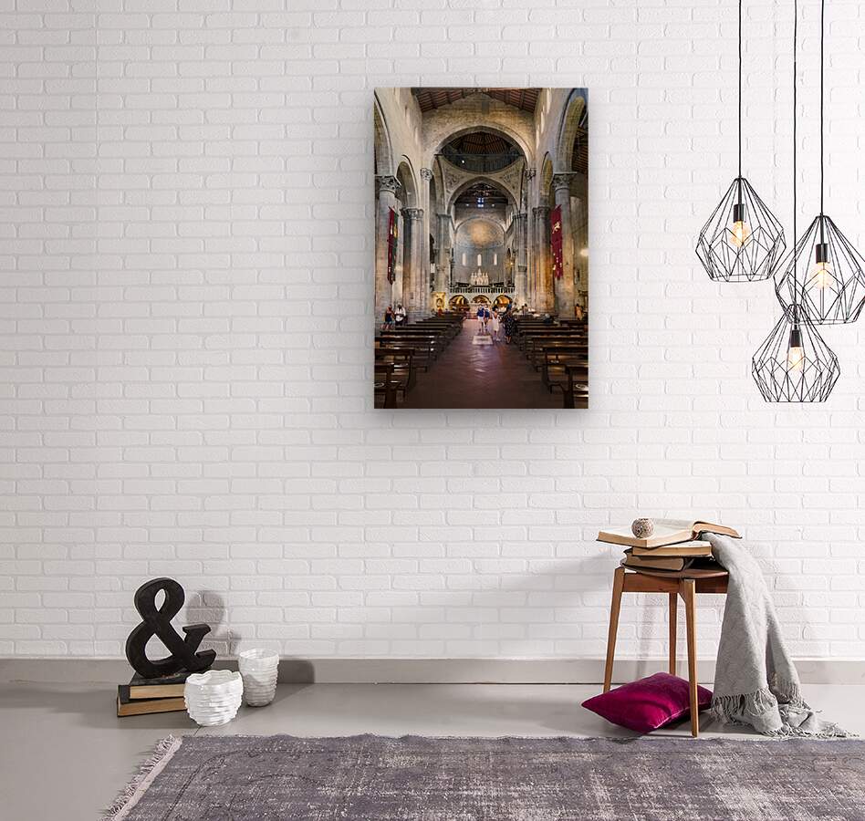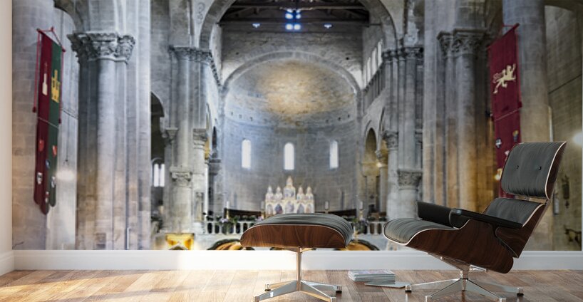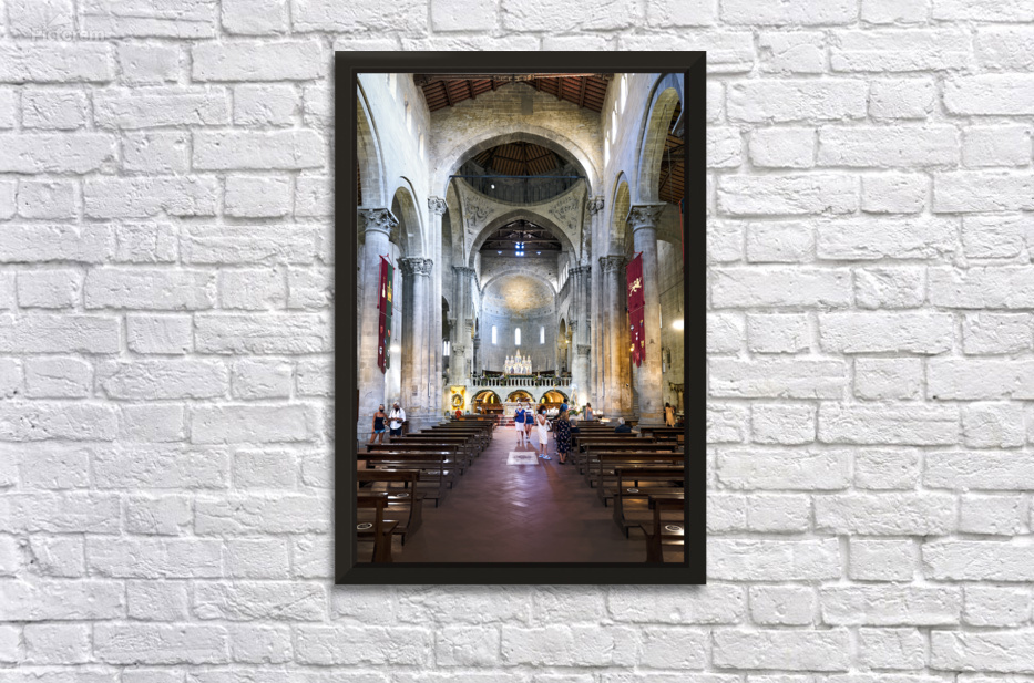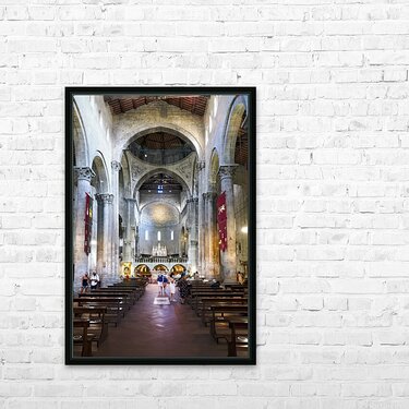 People walk through the interior of Santa Maria della Pieve in Arezzo. The church shows historical architecture and religious art.