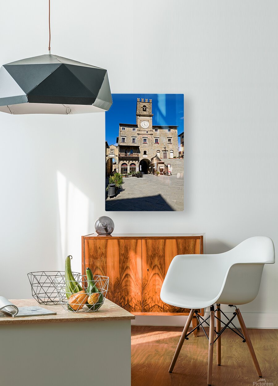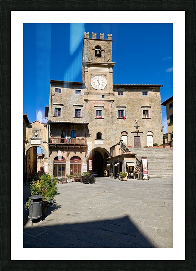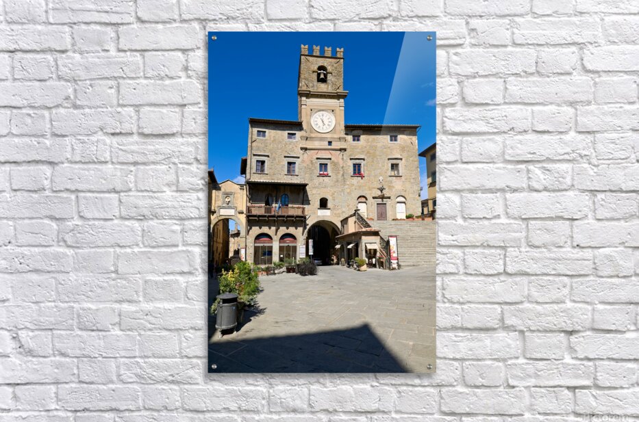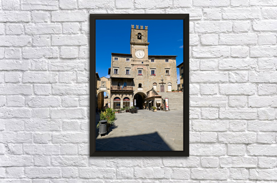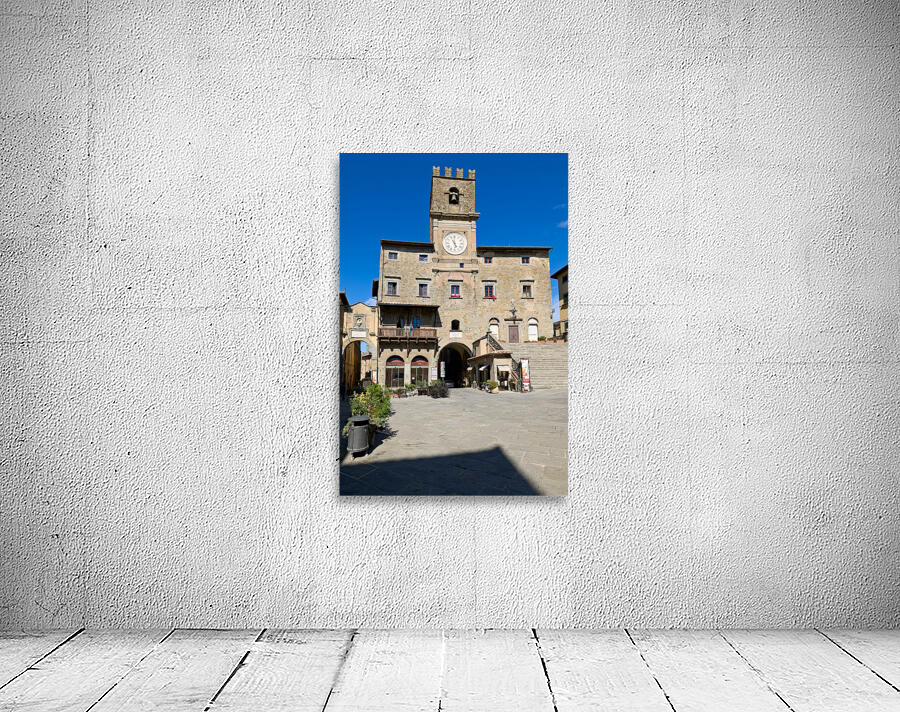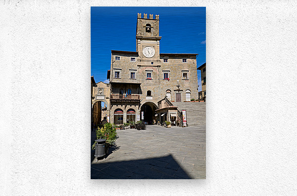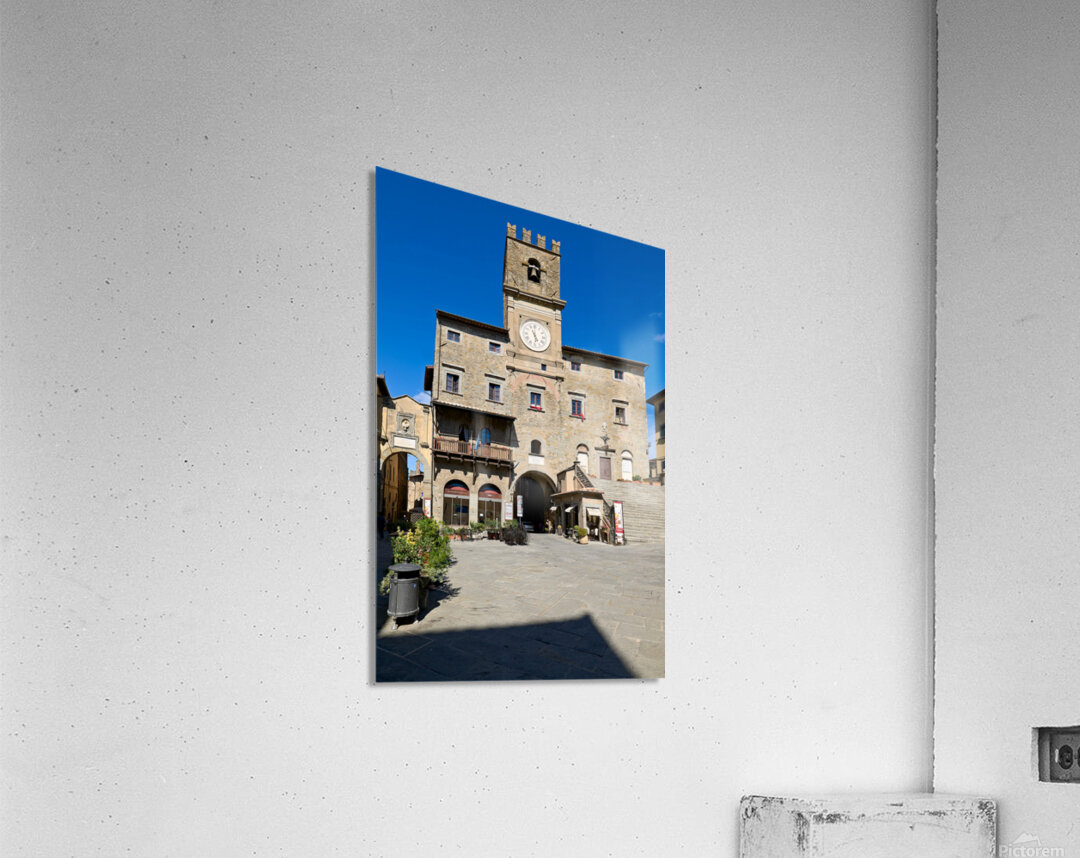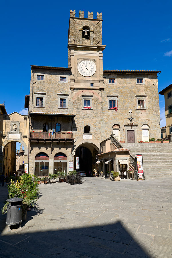 Cortona Tuscany Italy. Visitors walk in Piazza della Repubblica in Cortona. The clock tower stands tall against the clear blue sky.