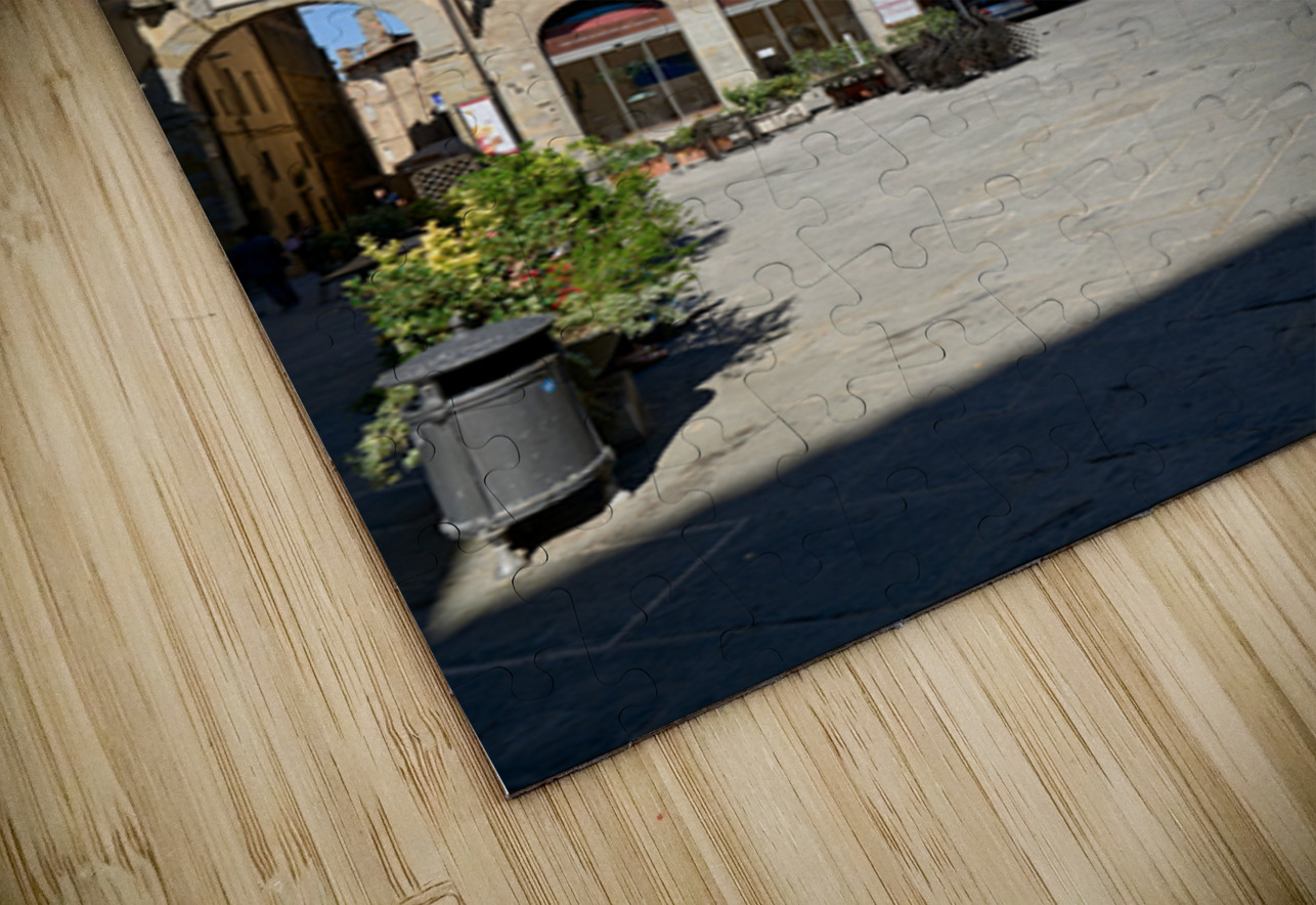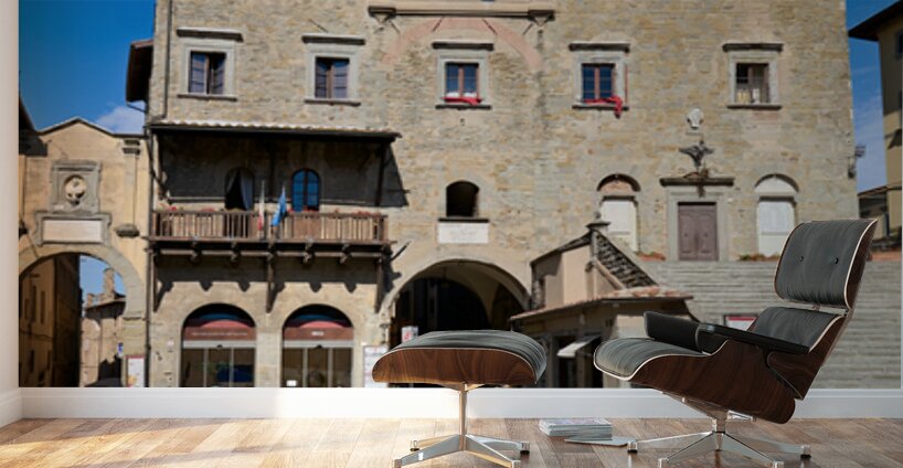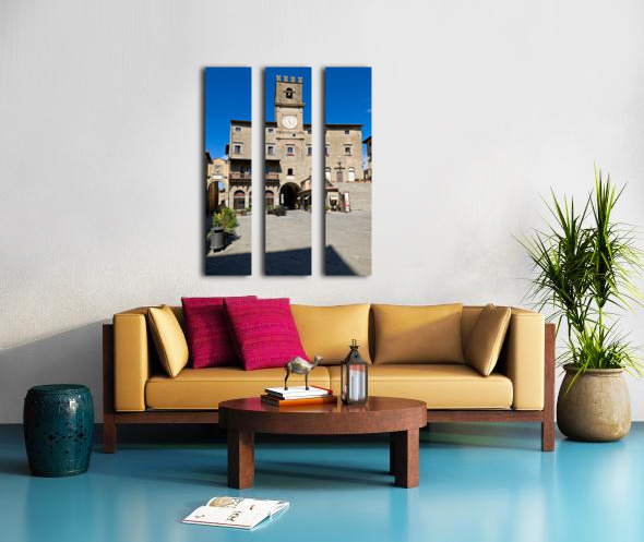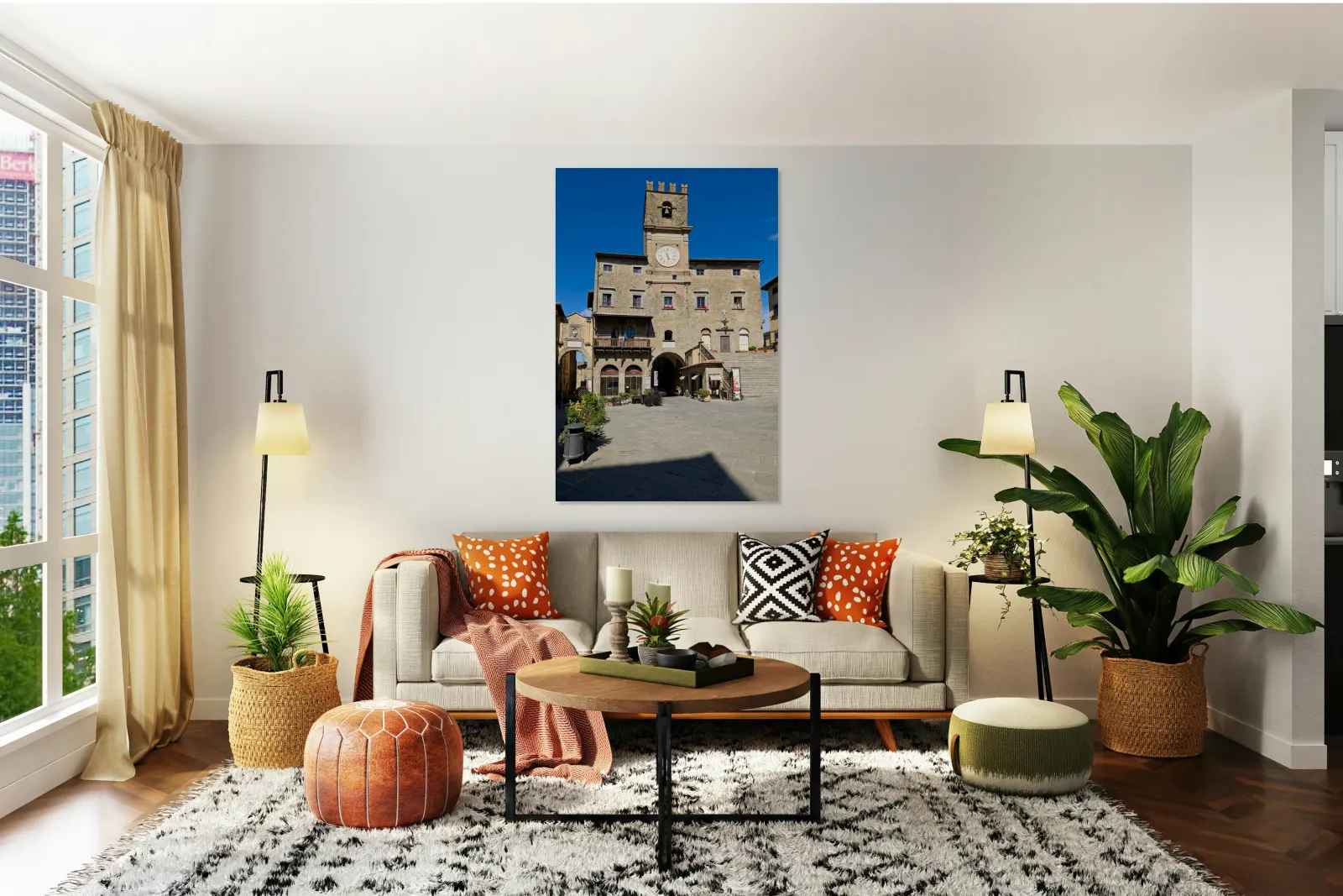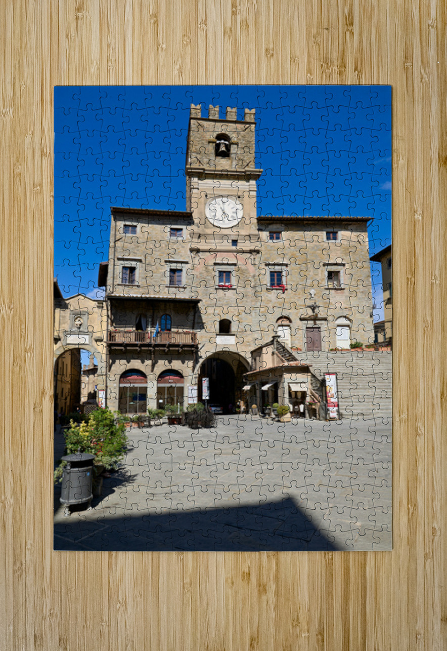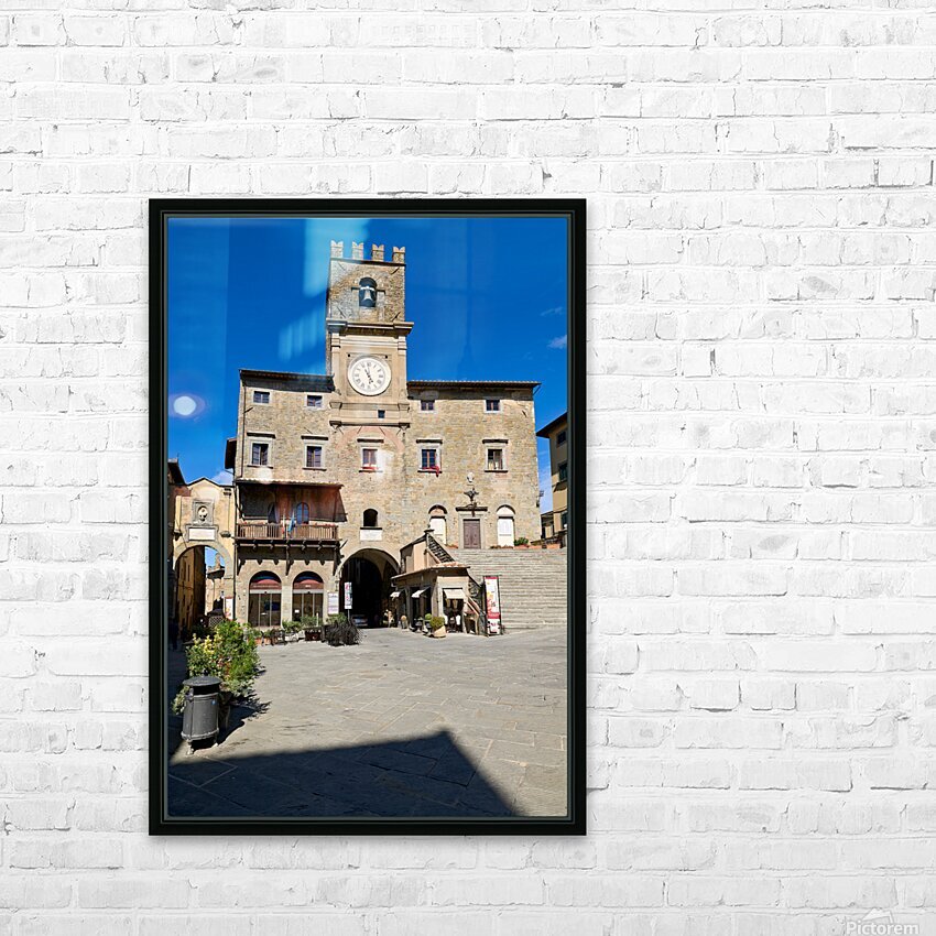 Cortona Tuscany Italy. Visitors walk in Piazza della Repubblica in Cortona. The clock tower stands tall against the clear blue sky.