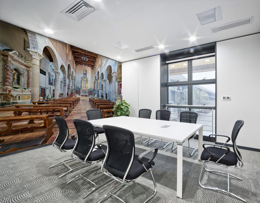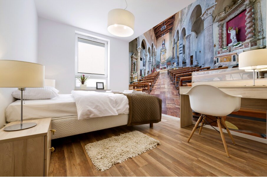 Visitors admire the interior of San Michele in Borgo Church. Wooden benches fill the space as sunlight streams through windows.