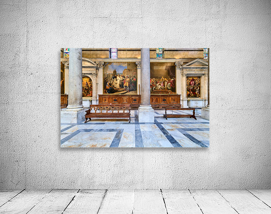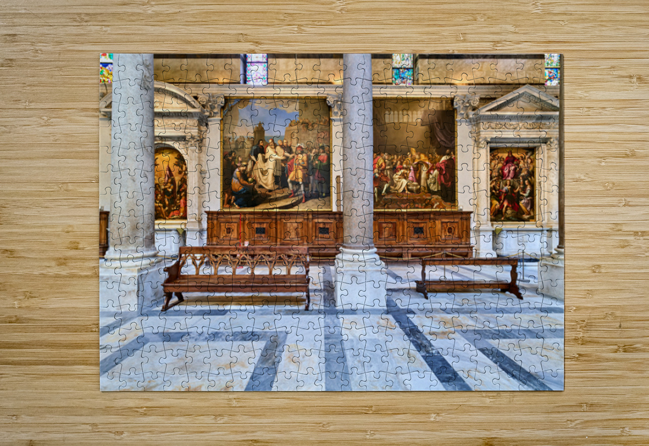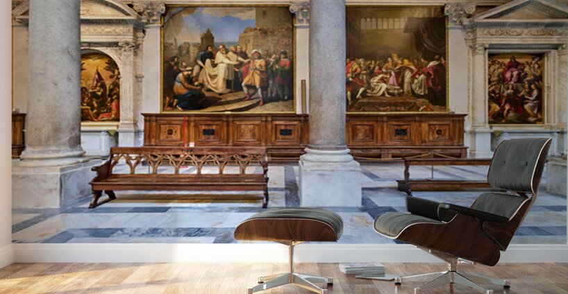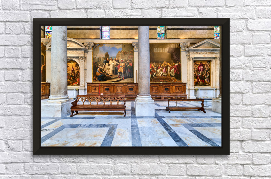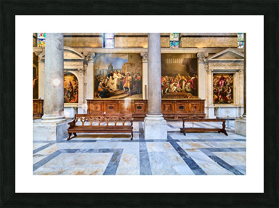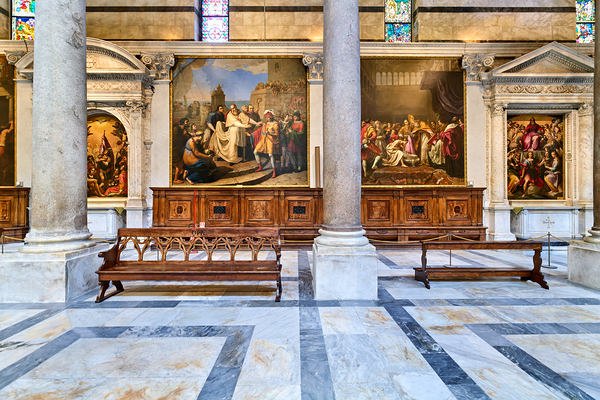 Inside the Cathedral in Pisa visitors see large paintings stone columns and wooden benches arranged in a quiet space for worship.
