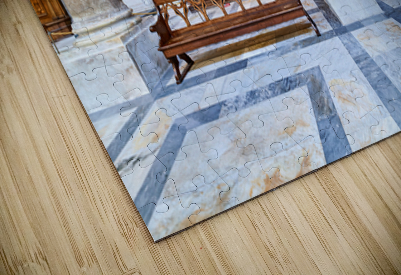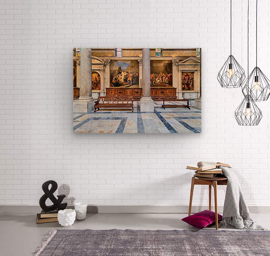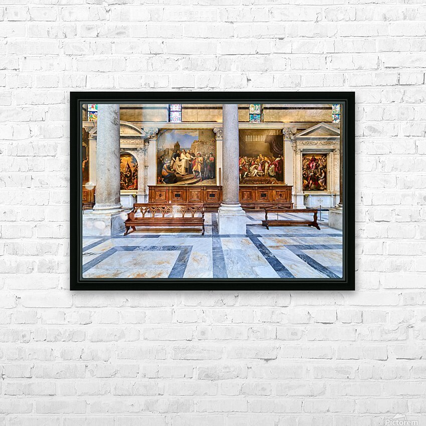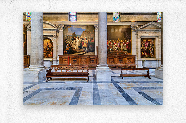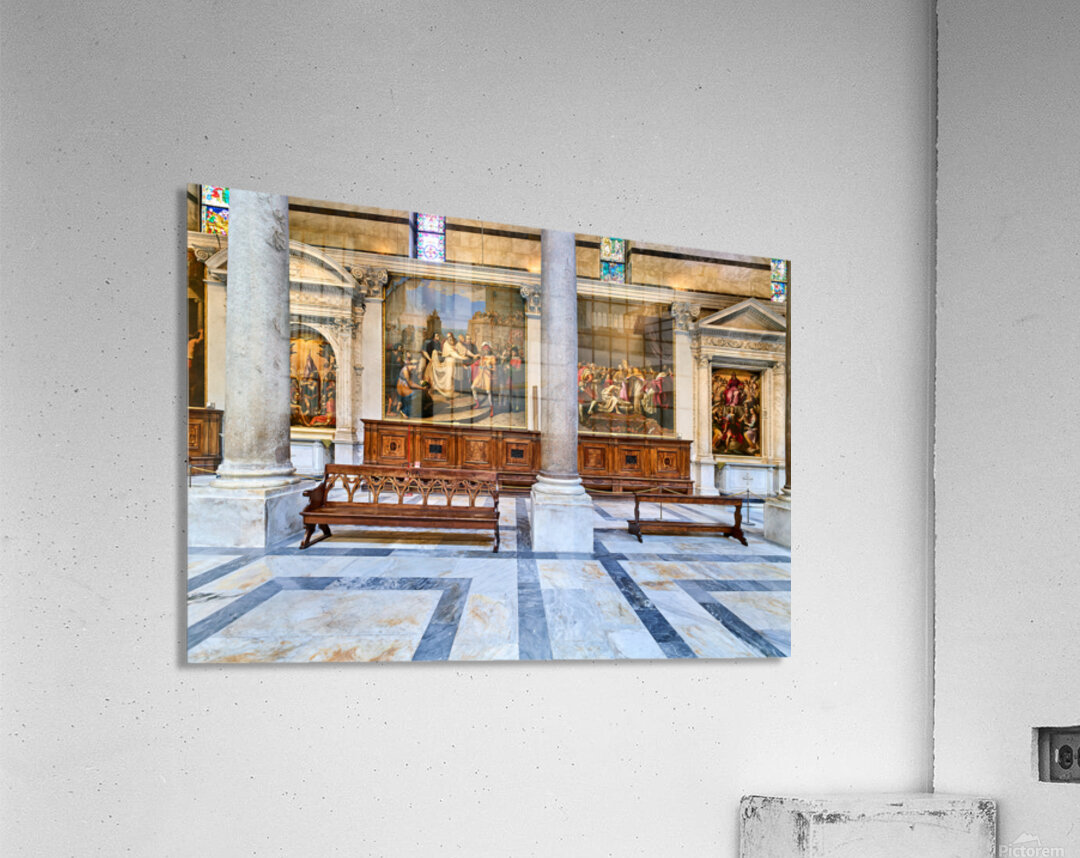 Inside the Cathedral in Pisa visitors see large paintings stone columns and wooden benches arranged in a quiet space for worship.