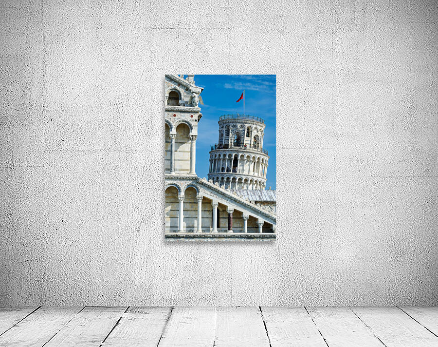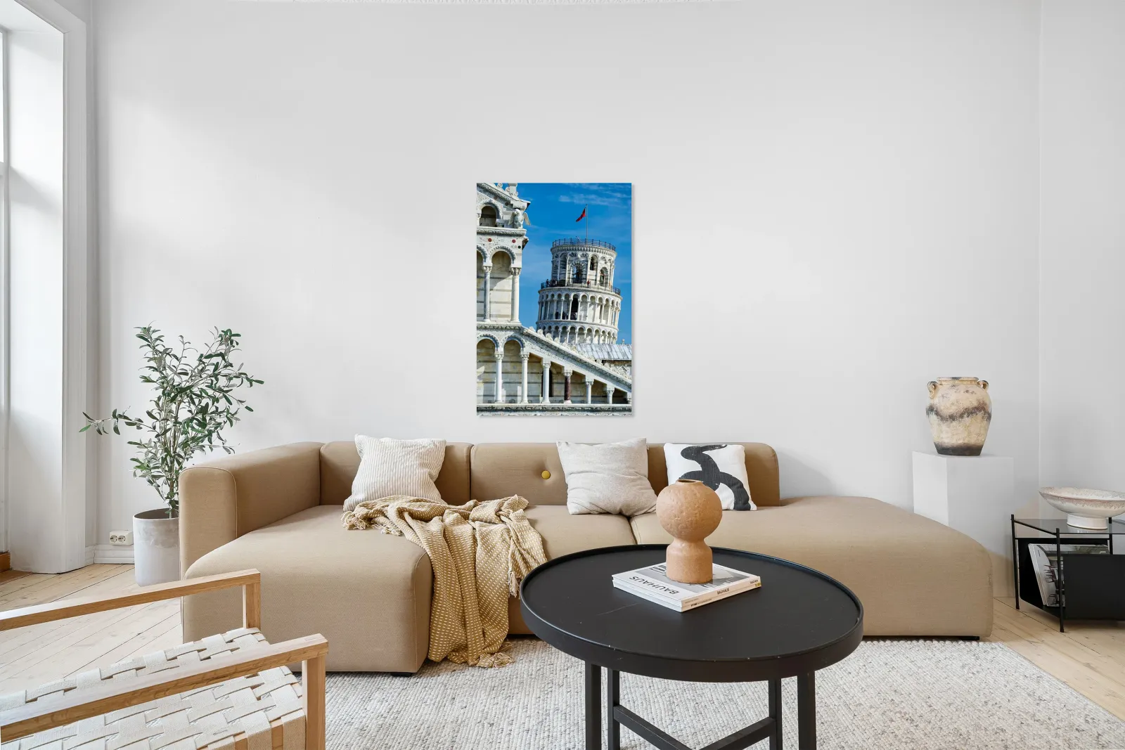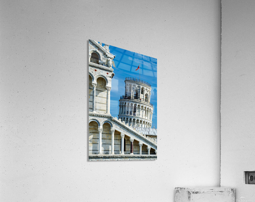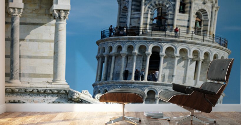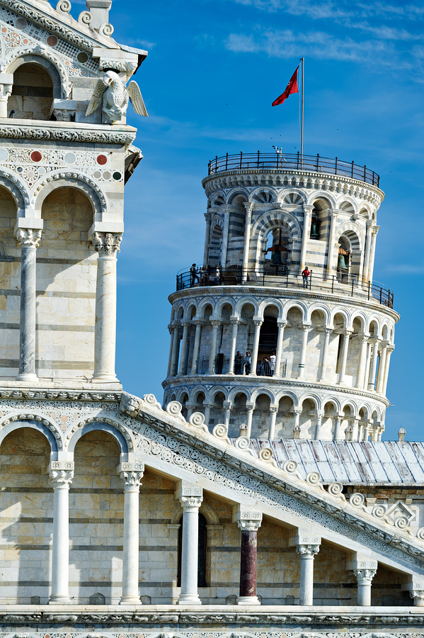Tourists gather at Piazza dei Miracoli in Pisa. The Leaning Tower stands alongside the Cathedral under a clear blue sky.