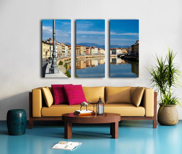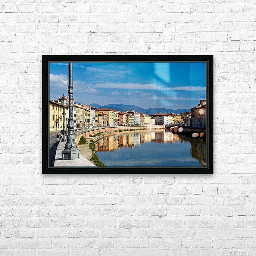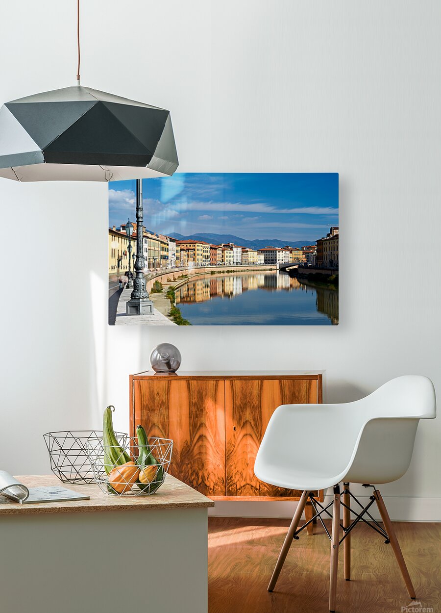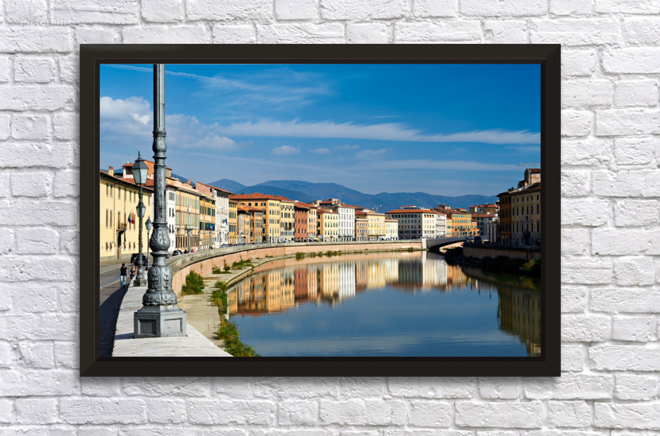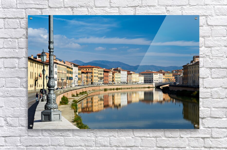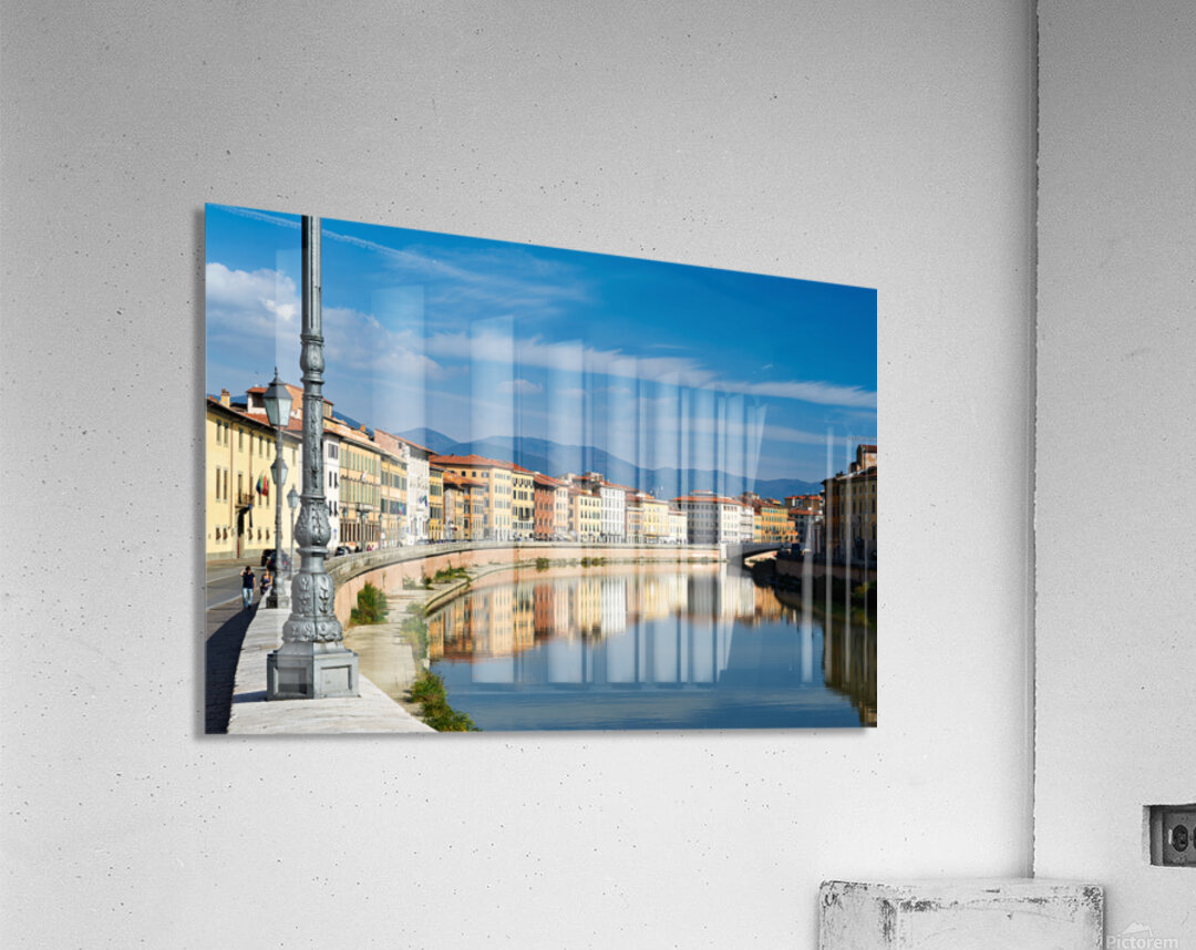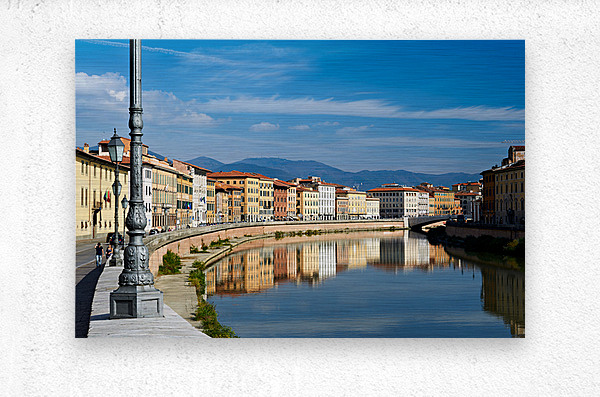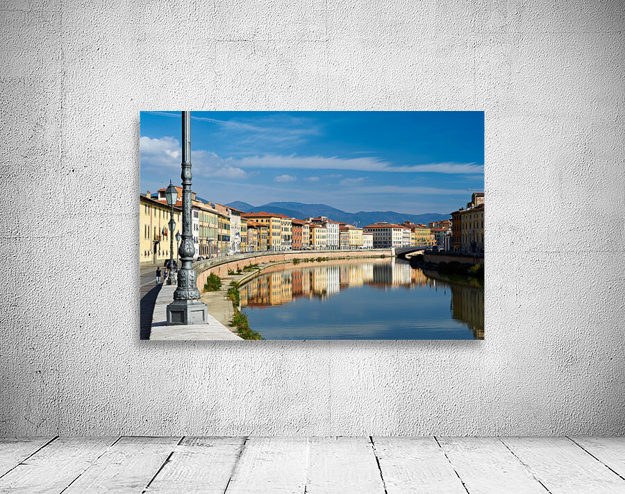 People walk along the riverbank in Pisa while buildings reflect on the calm water of the Arno river under a blue sky.