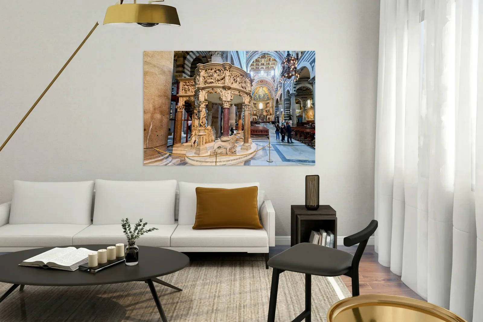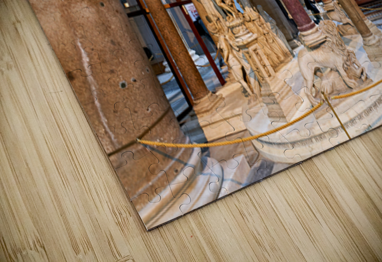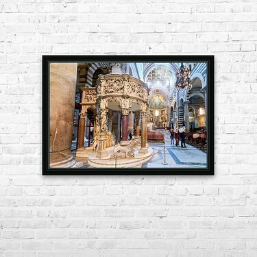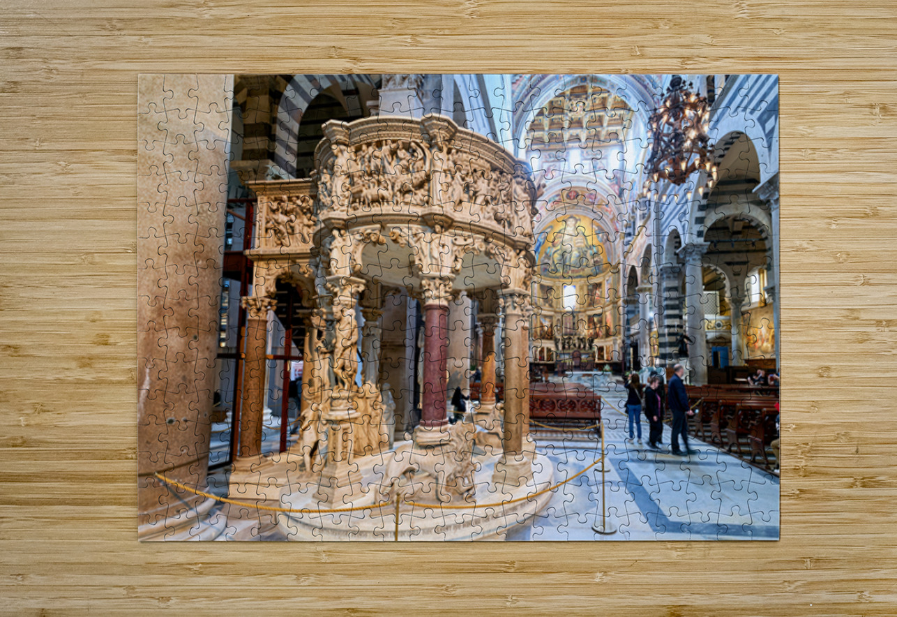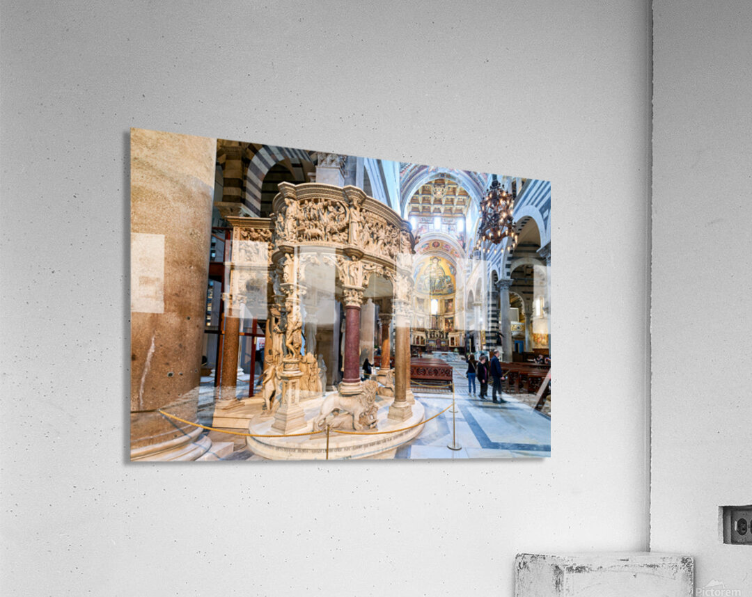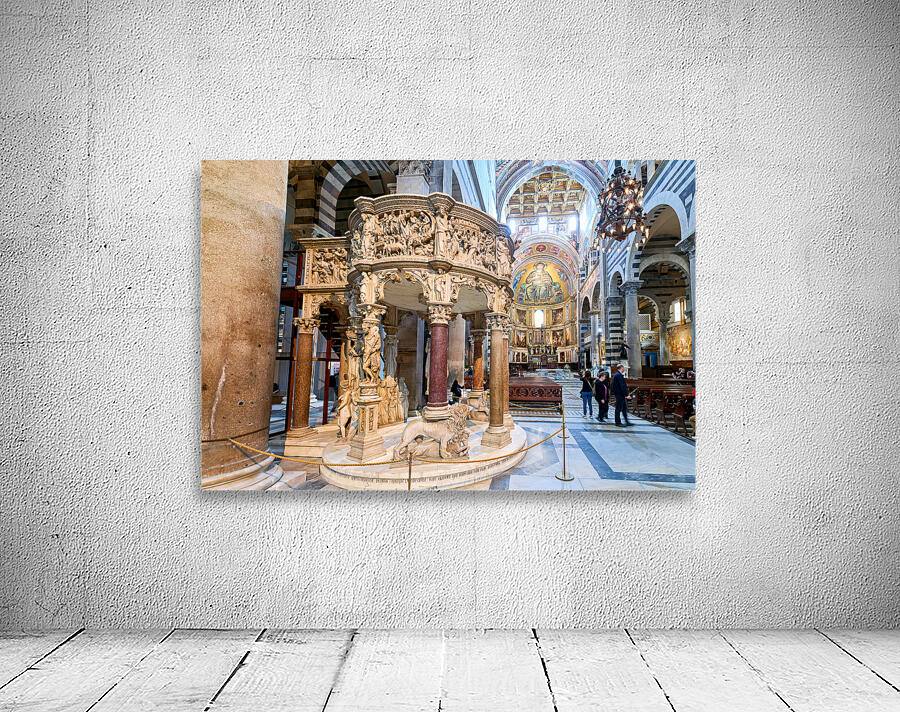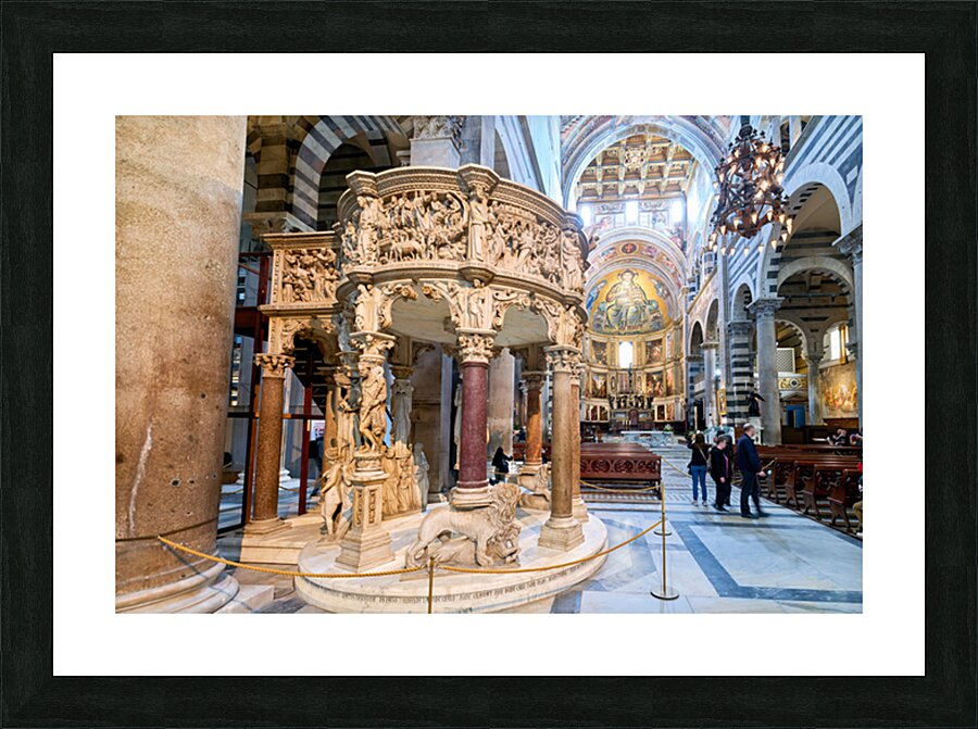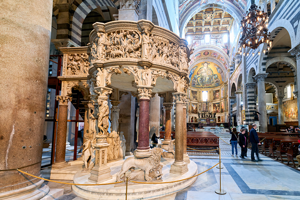 Visitors view the pulpit sculpted by Giovanni Pisano inside the Cathedral in Pisa Tuscany Italy. The pulpit displays detailed carvings.