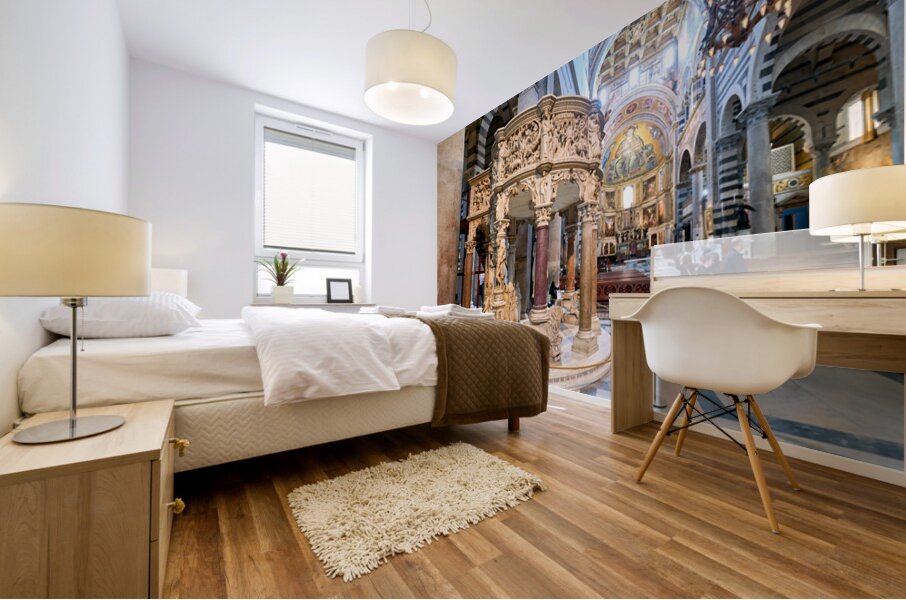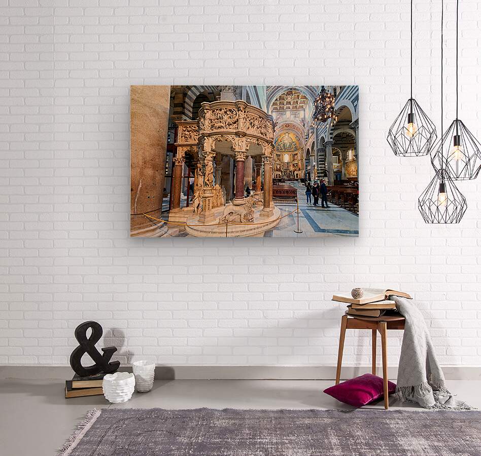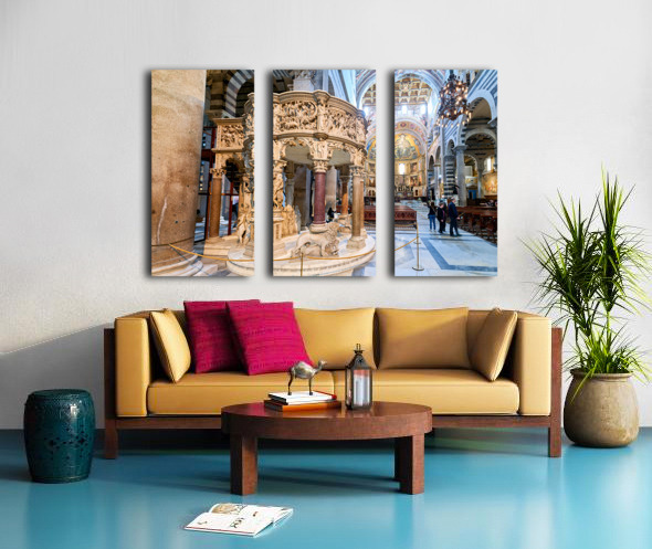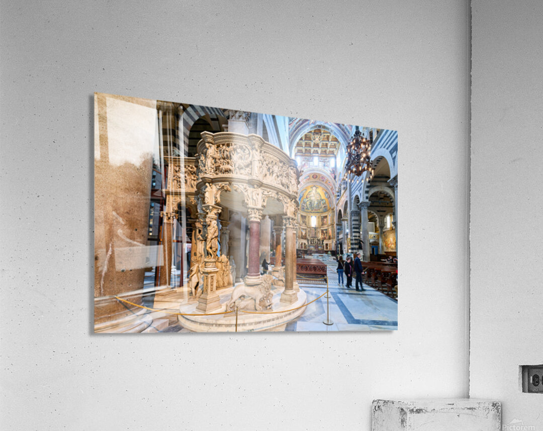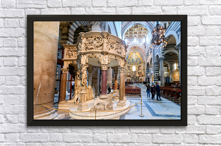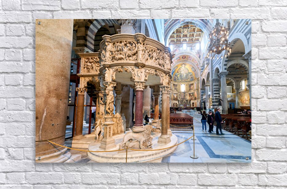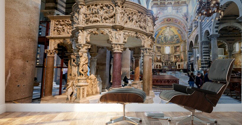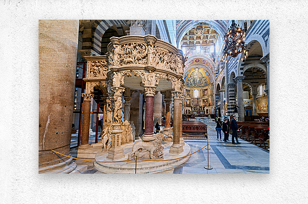 Visitors view the pulpit sculpted by Giovanni Pisano inside the Cathedral in Pisa Tuscany Italy. The pulpit displays detailed carvings.