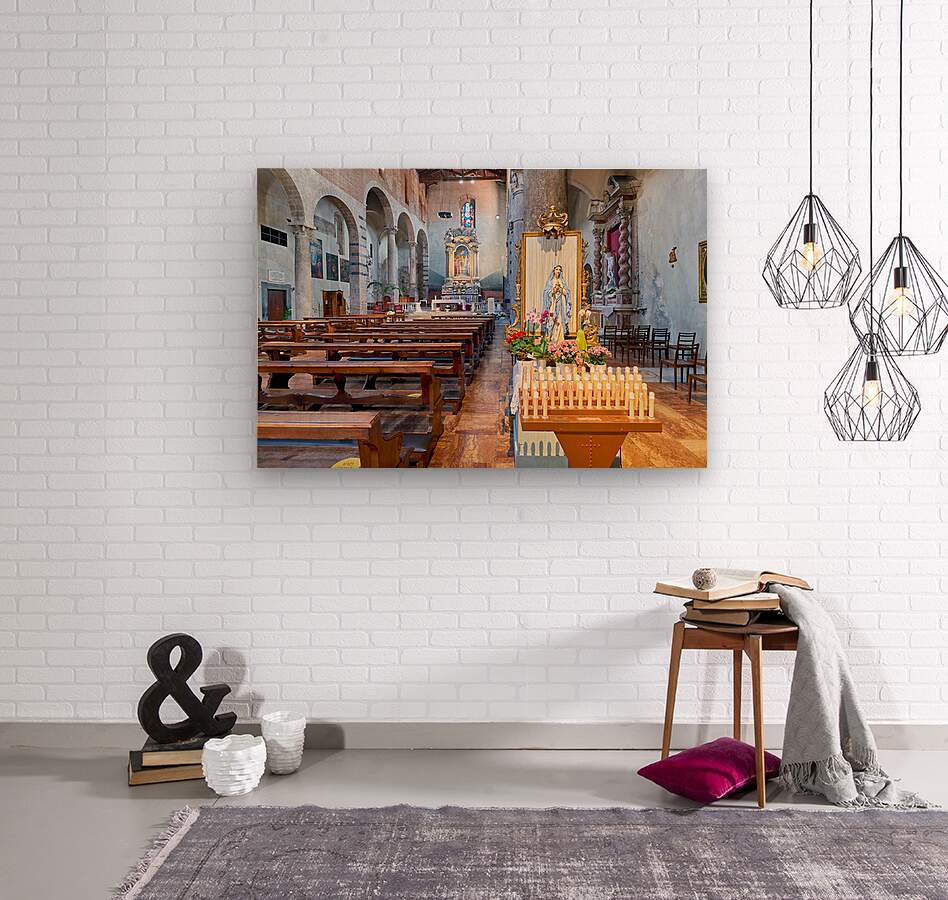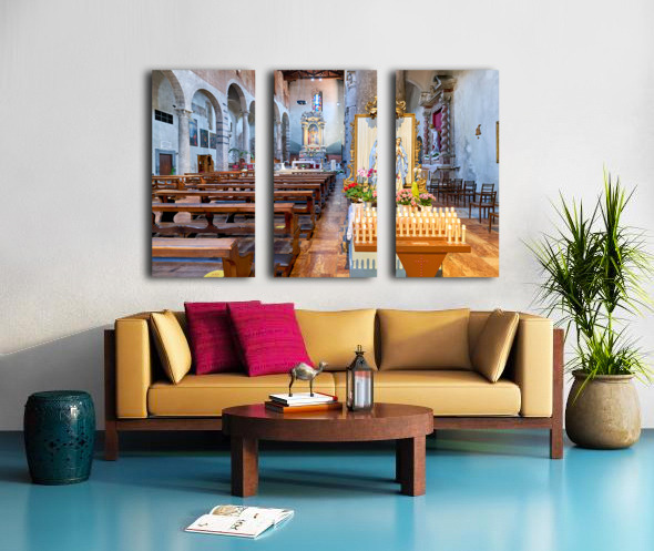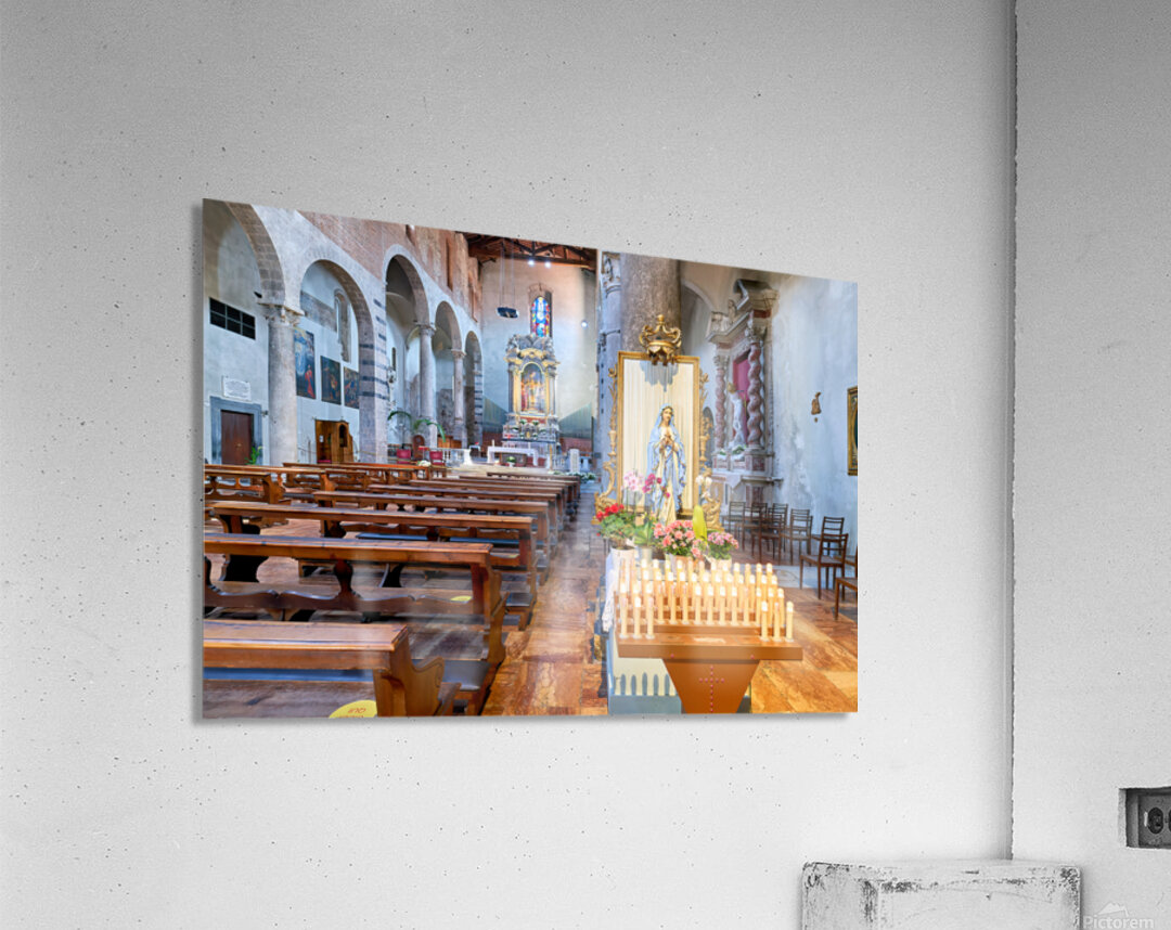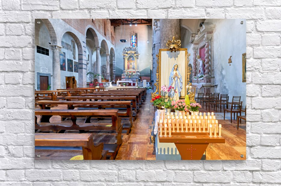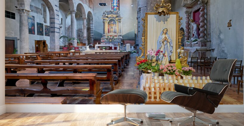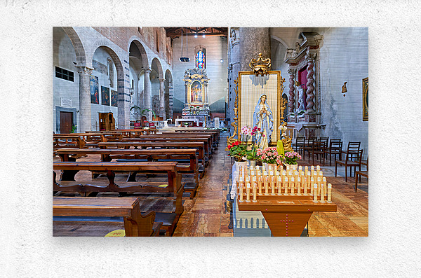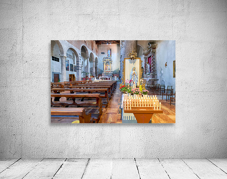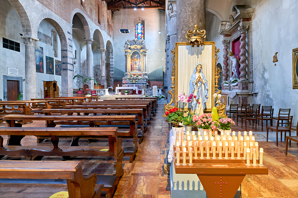 Inside the Church of San Michele in Borgo rows of benches face an altar. A statue of Mary stands near lit candles.