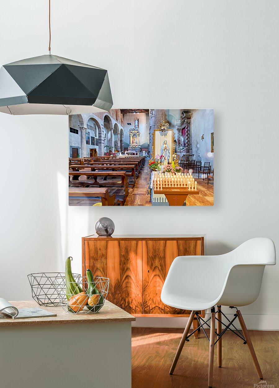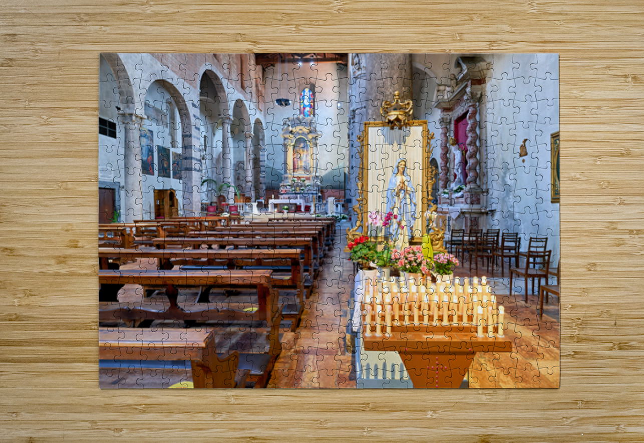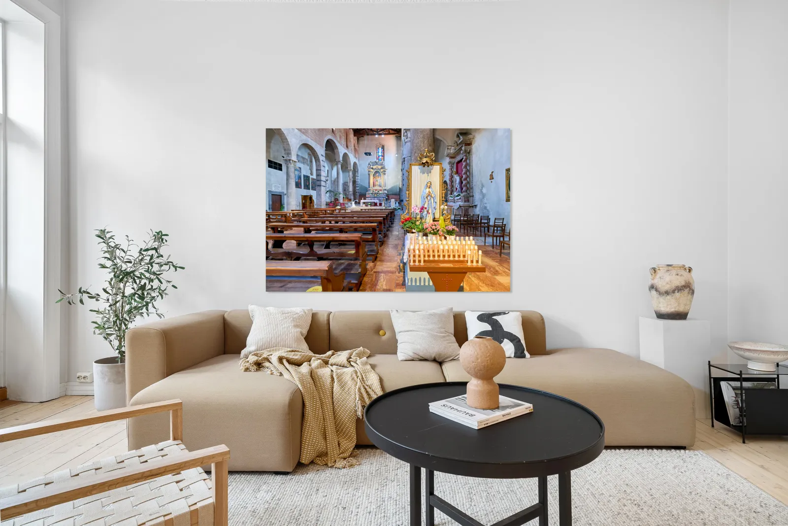 Inside the Church of San Michele in Borgo rows of benches face an altar. A statue of Mary stands near lit candles.