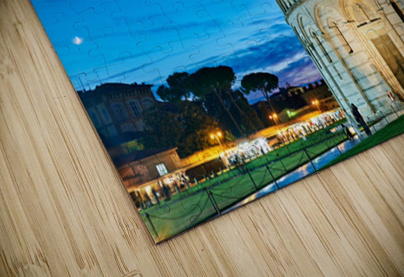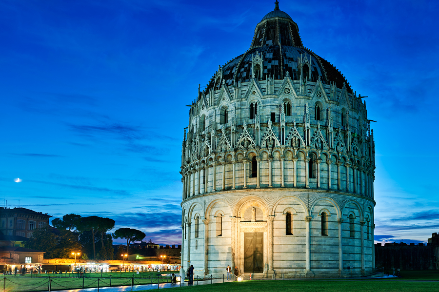 Visitors admire the Baptistery in Piazza dei Miracoli during sunset. The sky changes colors while dusk approaches.