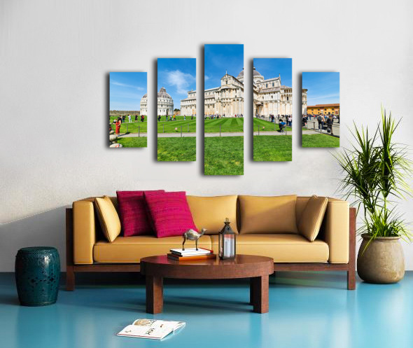 People walk in Piazza dei Miracoli admiring the Baptistry and Cathedral in Pisa. The sun shines on the historic buildings and green grass. Canvas print