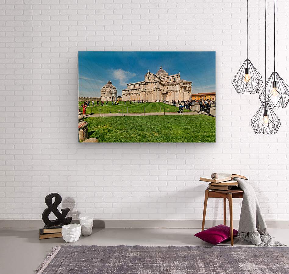 ABOUT THIS ARTWORK: PEOPLE WALK IN PIAZZA DEI MIRACOLI ADMIRING THE BAPTISTRY AND CATHEDRAL IN PISA. THE SUN SHINES ON THE HISTORIC BUILDINGS AND GREEN GRASS.