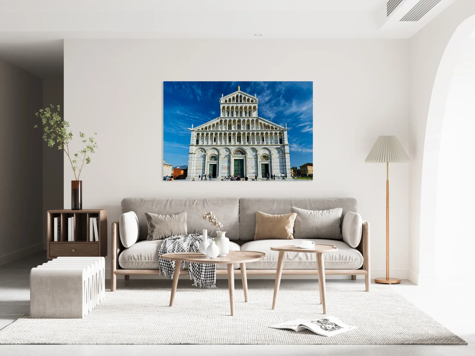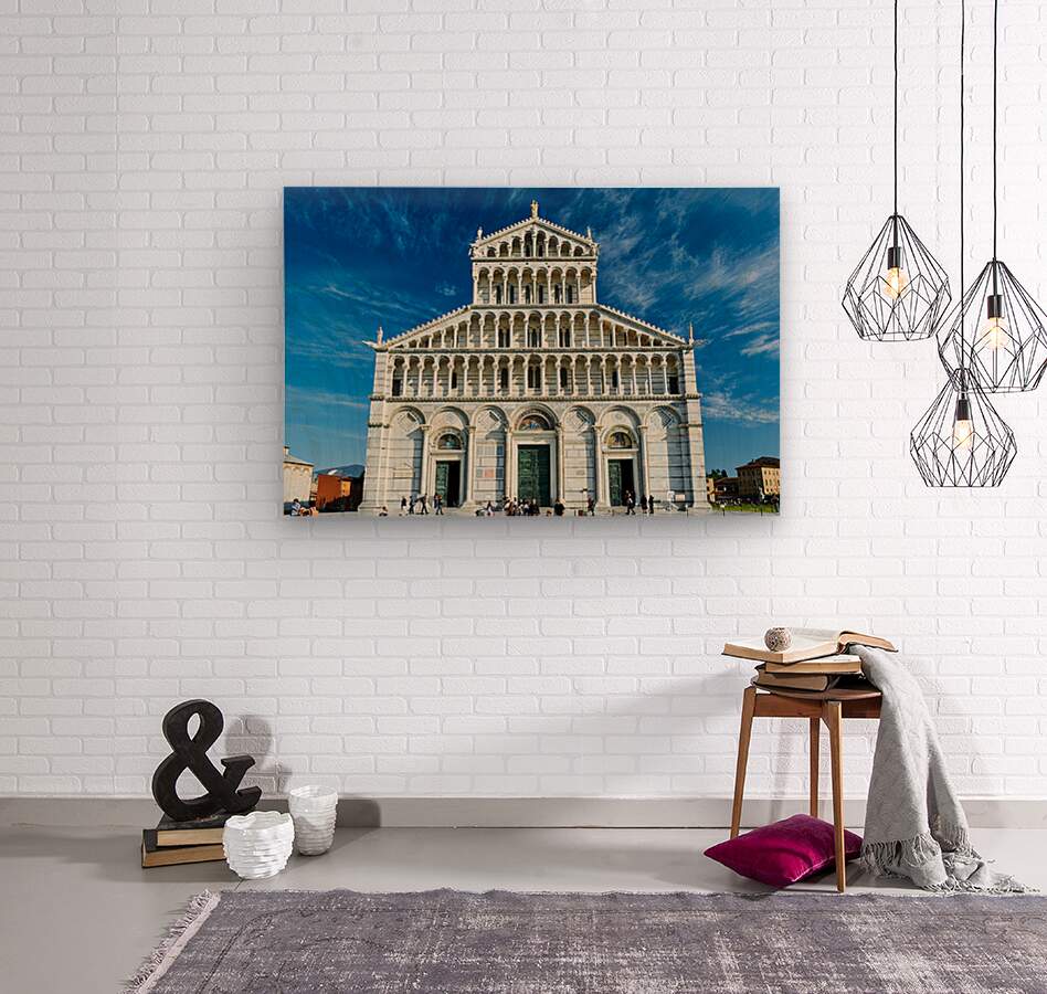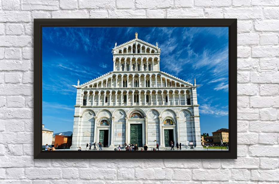 "Visitors walk around Pisa Cathedral in Piazza dei Miracoli. The tall structure stands under a blue sky. People enjoy the lively atmosphere." in a framed print.