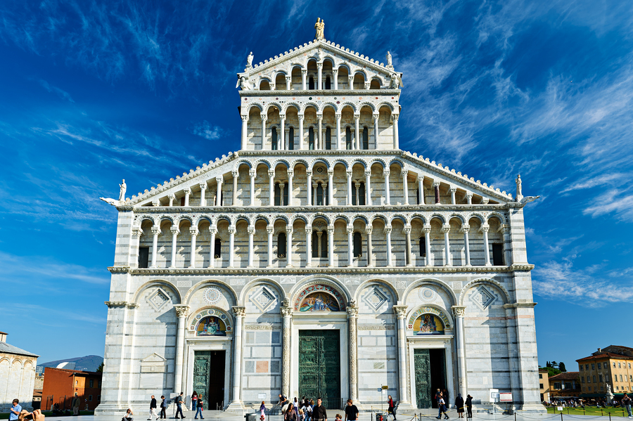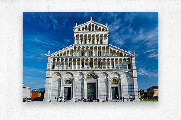 ABOUT THIS ARTWORK: VISITORS WALK AROUND PISA CATHEDRAL IN PIAZZA DEI MIRACOLI. THE TALL STRUCTURE STANDS UNDER A BLUE SKY. PEOPLE ENJOY THE LIVELY ATMOSPHERE.