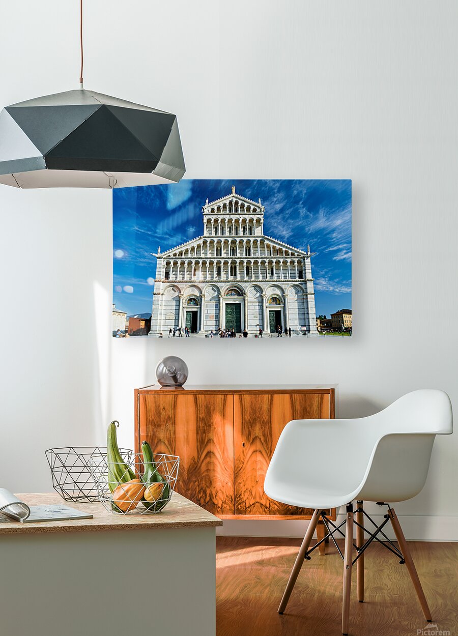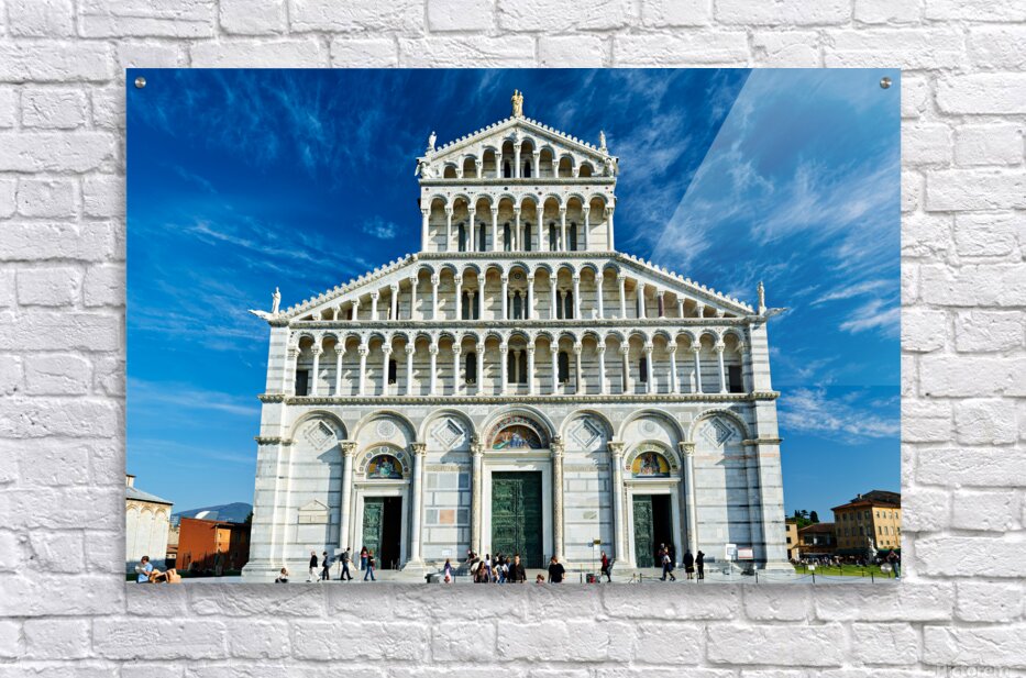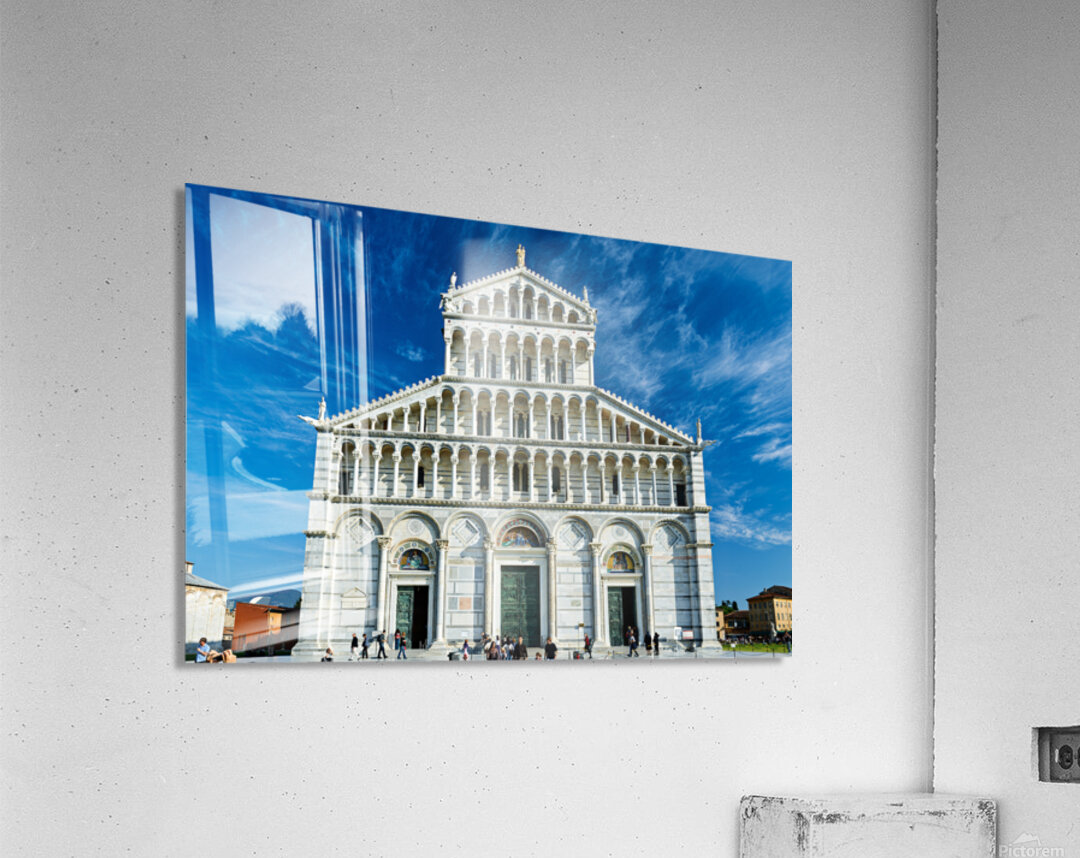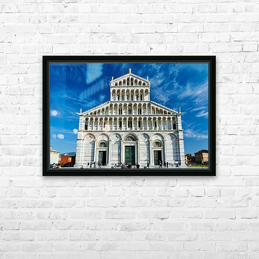 Visitors walk around Pisa Cathedral in Piazza dei Miracoli. The tall structure stands under a blue sky. People enjoy the lively atmosphere. Frame print