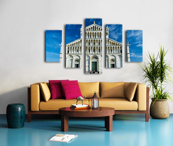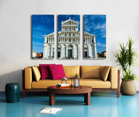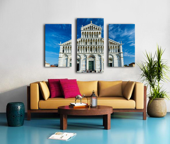 Visitors walk around Pisa Cathedral in Piazza dei Miracoli. The tall structure stands under a blue sky. People enjoy the lively atmosphere. Canvas print