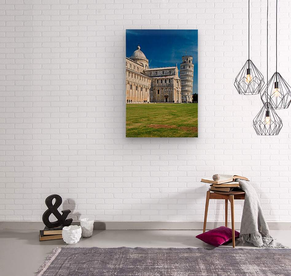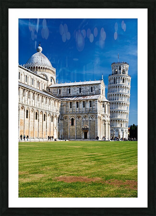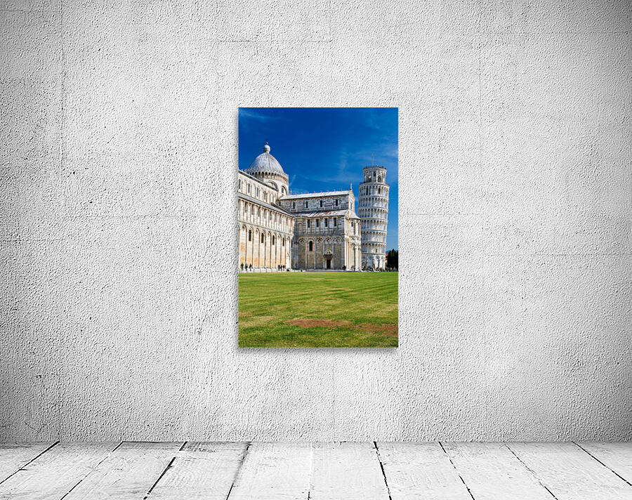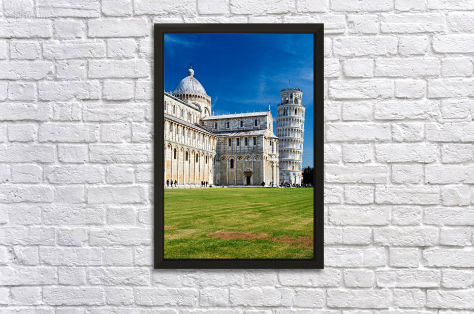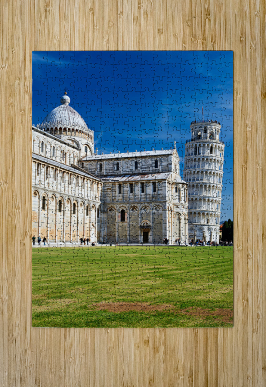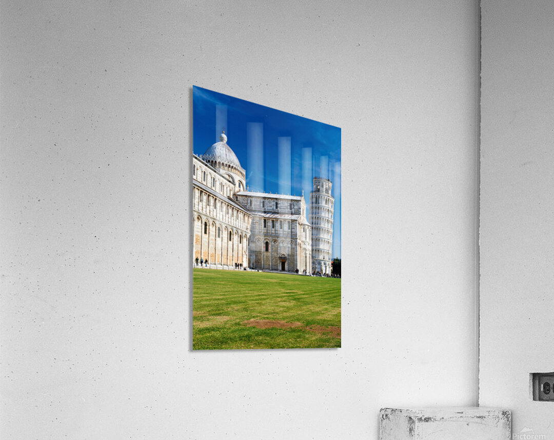 Visitors gather in Piazza dei Miracoli to see the Leaning Tower and Cathedral in Pisa Tuscany under a clear blue sky.