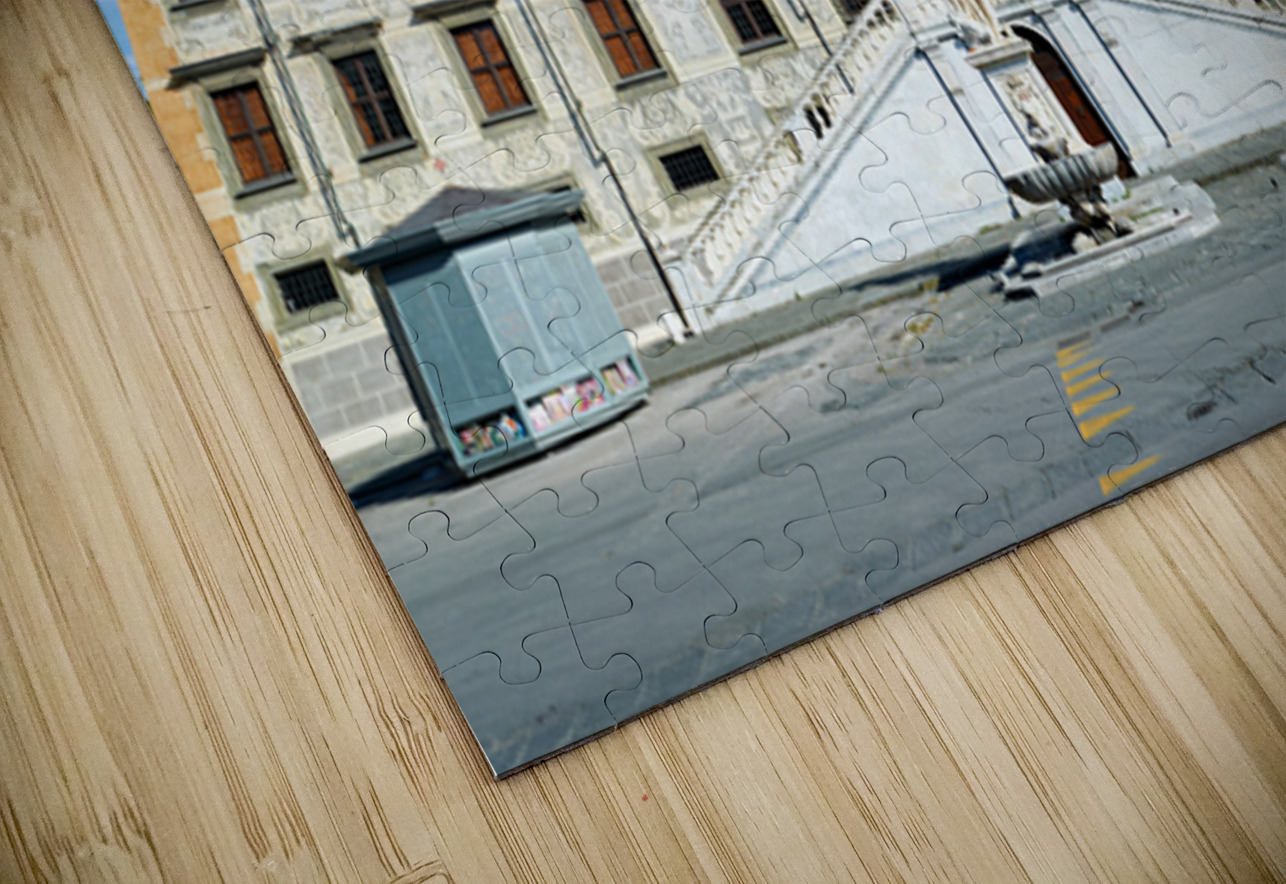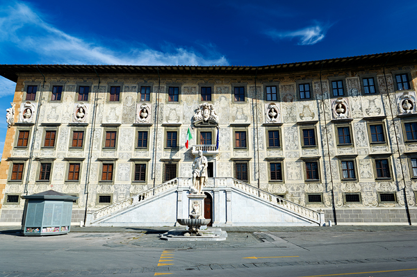 Visitors gather in Piazza dei Miracoli to see the Leaning Tower and Cathedral in Pisa Tuscany under a clear blue sky.