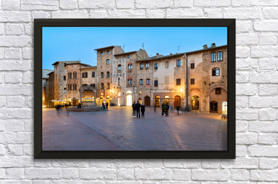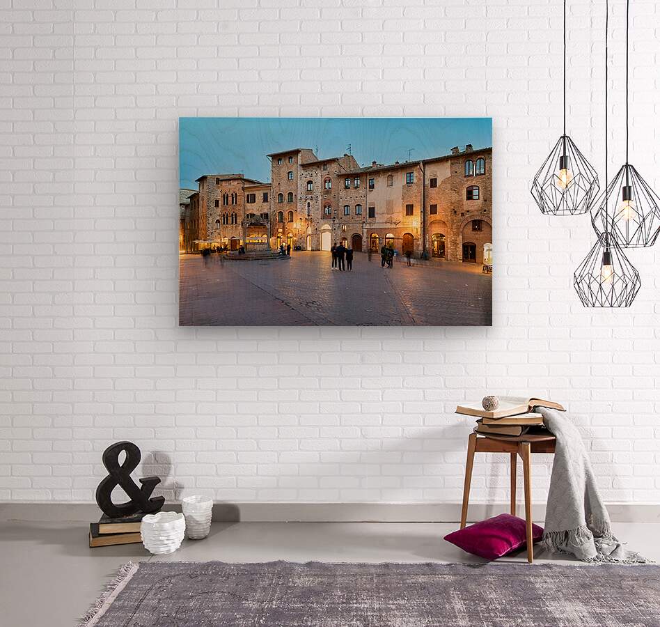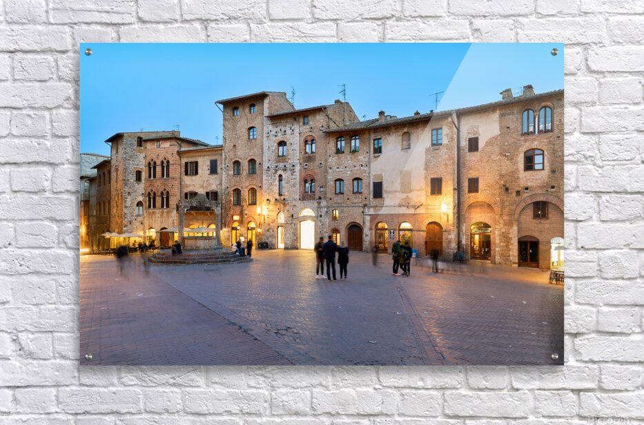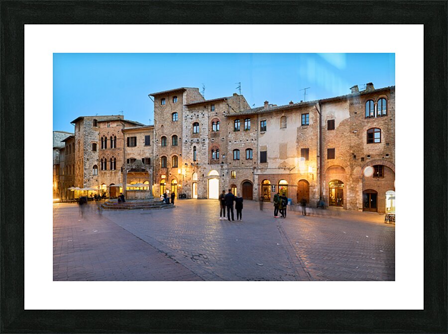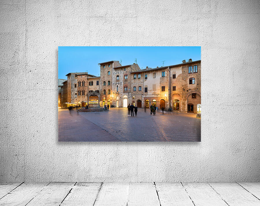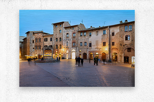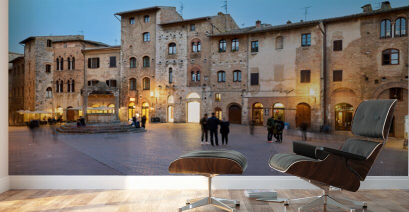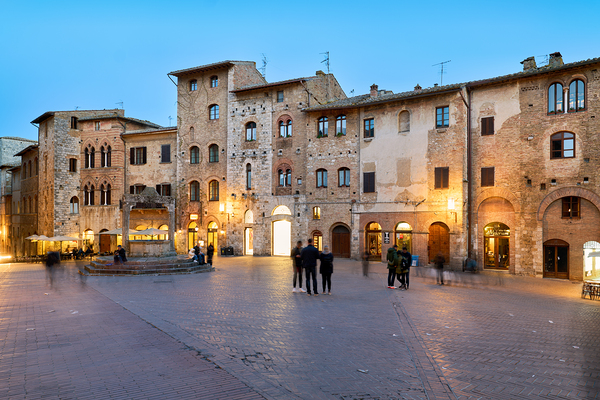 People walk and gather in Piazza della Cisterna as the sun sets over San Gimignano in Tuscany. Lights begin to glow on the buildings.