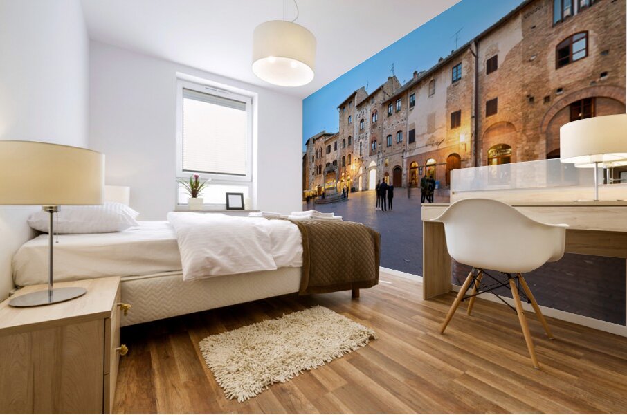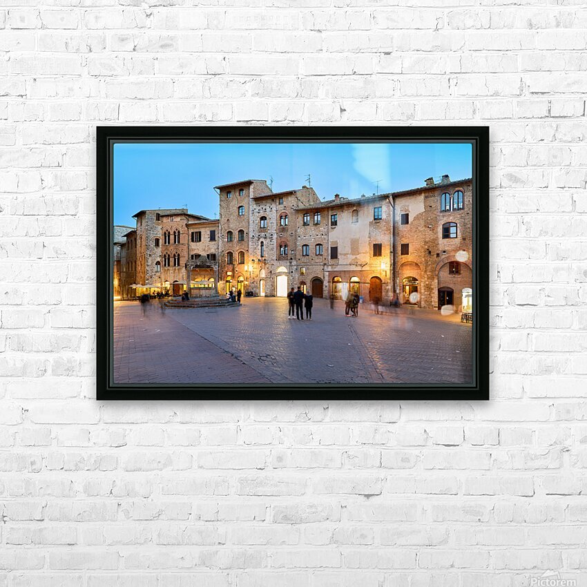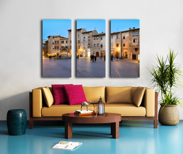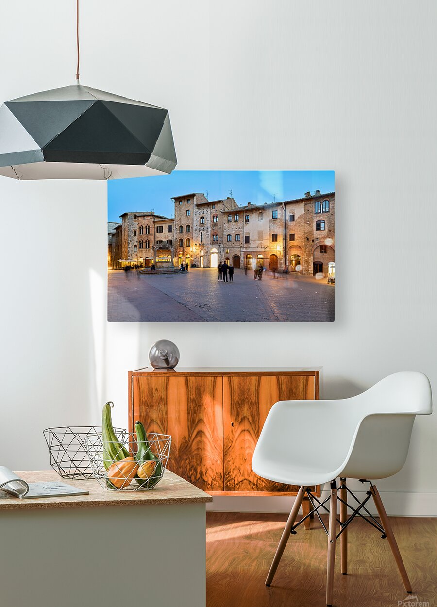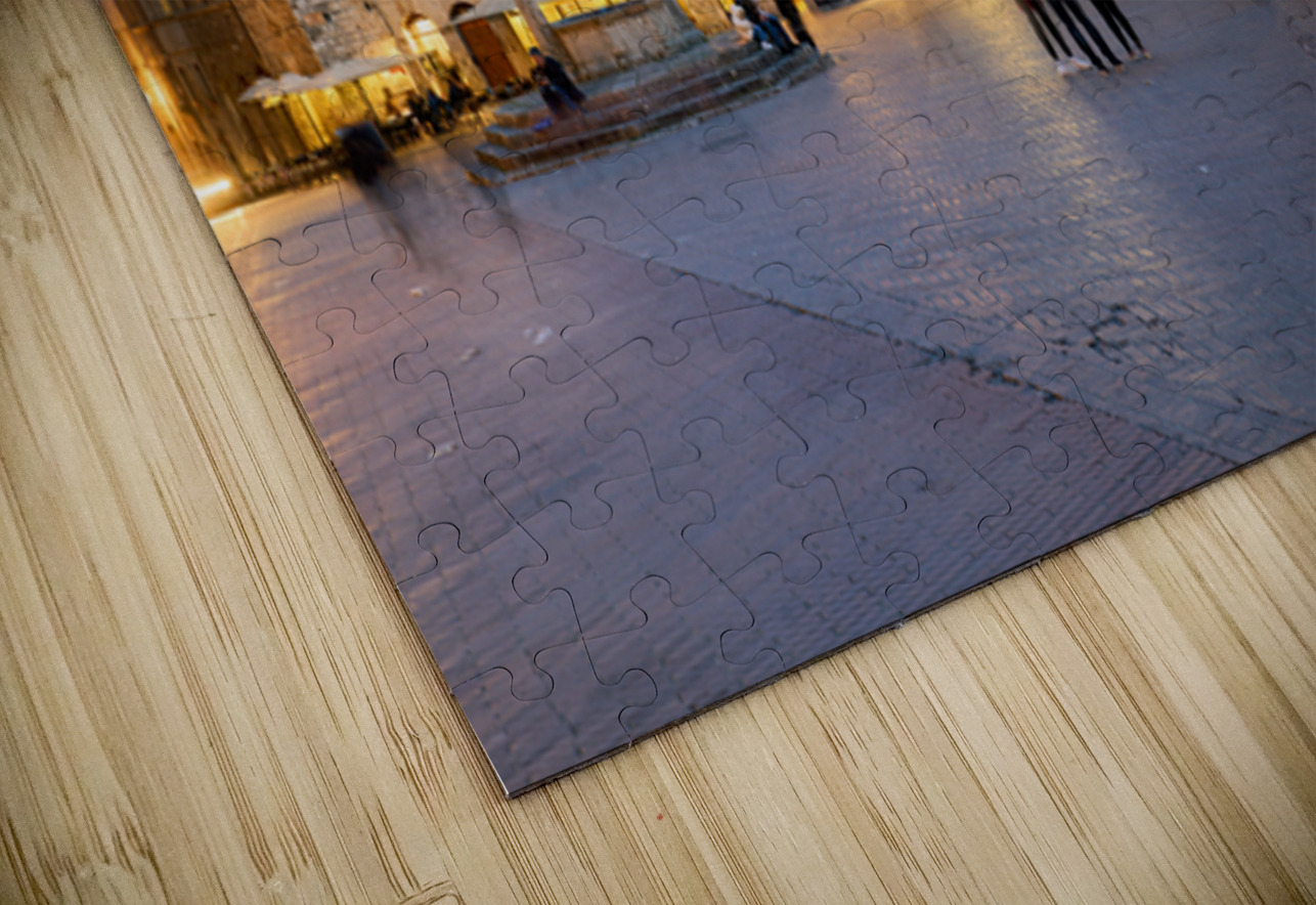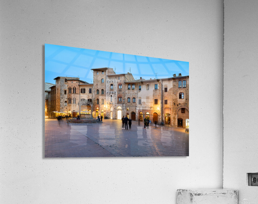 People walk and gather in Piazza della Cisterna as the sun sets over San Gimignano in Tuscany. Lights begin to glow on the buildings.