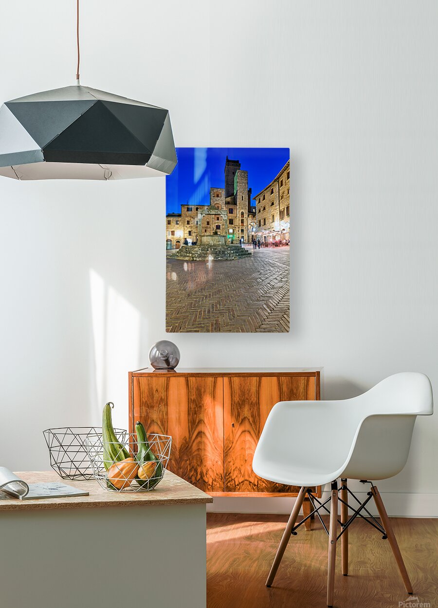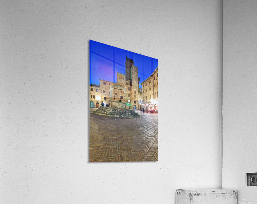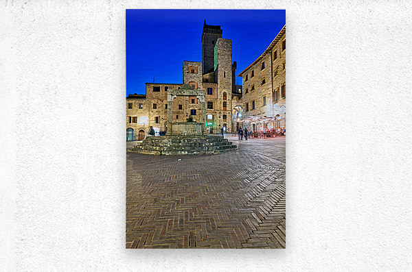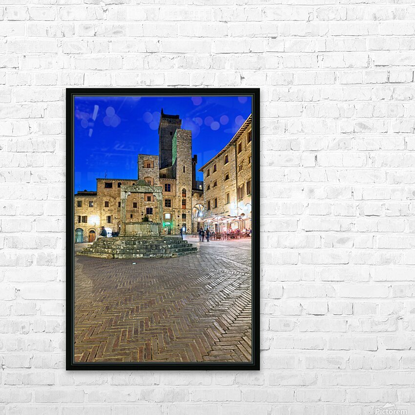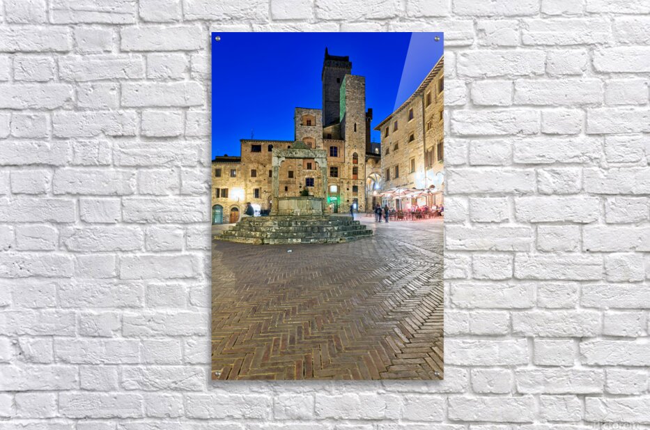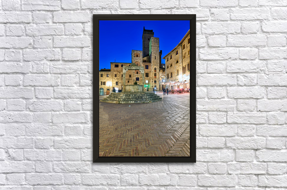 "Sunset in San Gimignano at Piazza della Cisterna" in a framed print.