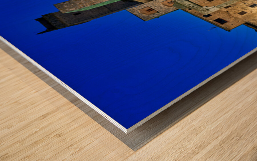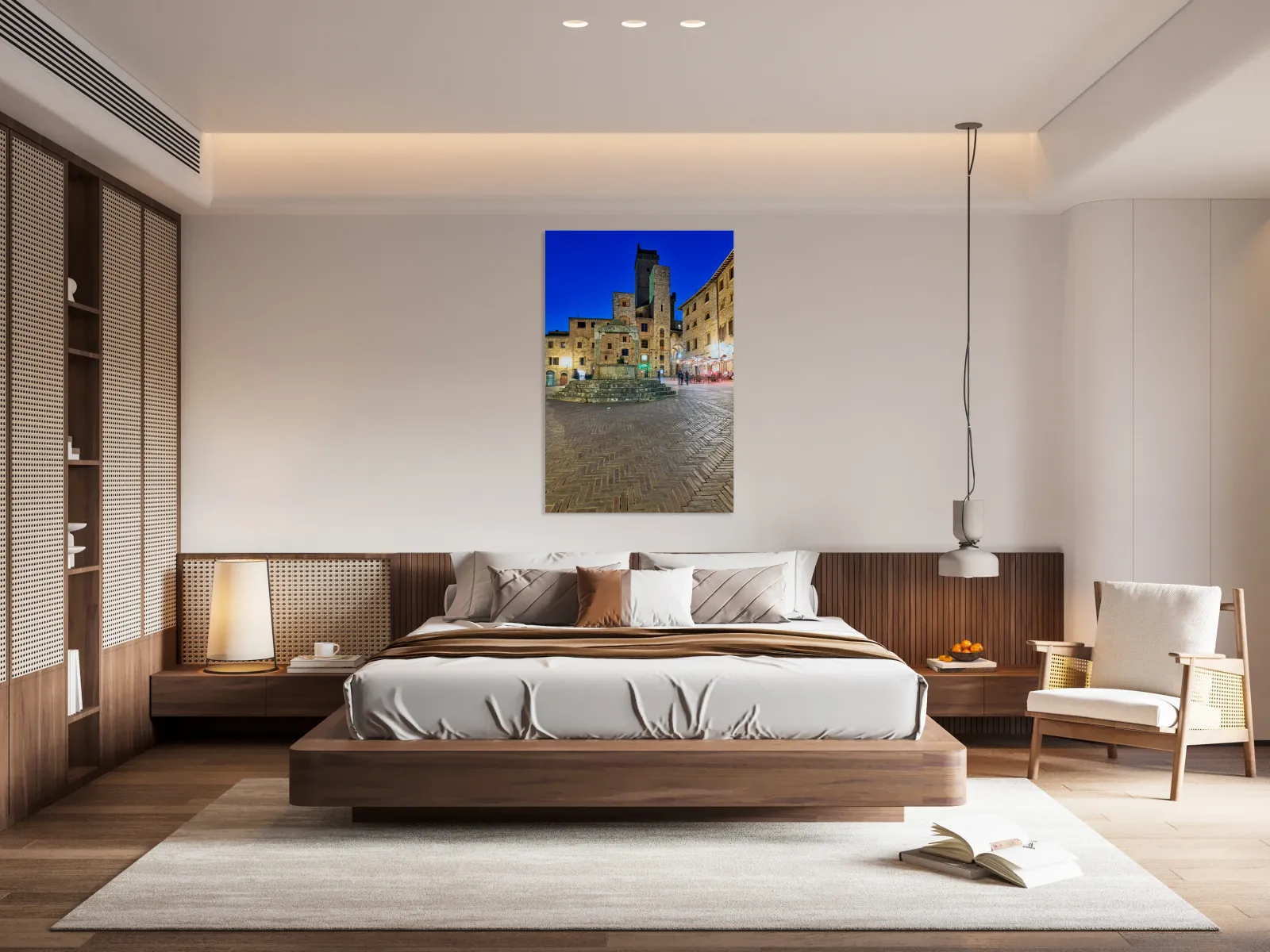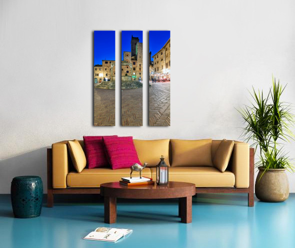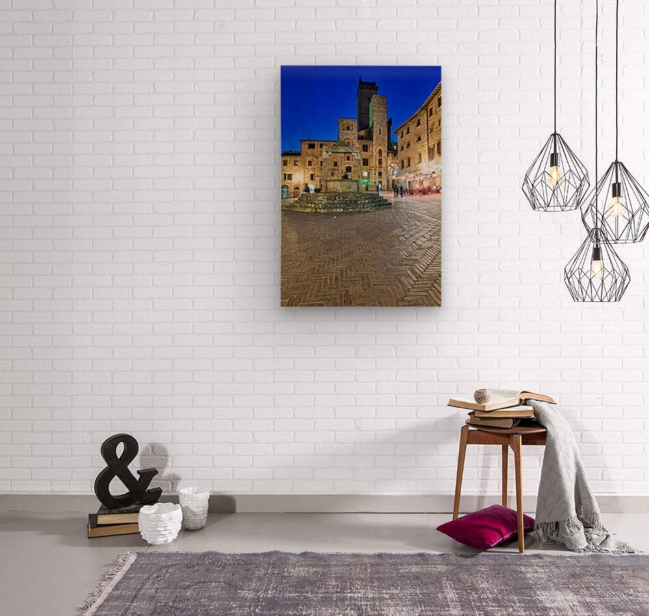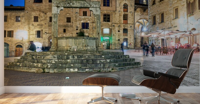 "Sunset in San Gimignano at Piazza della Cisterna" in a framed print.